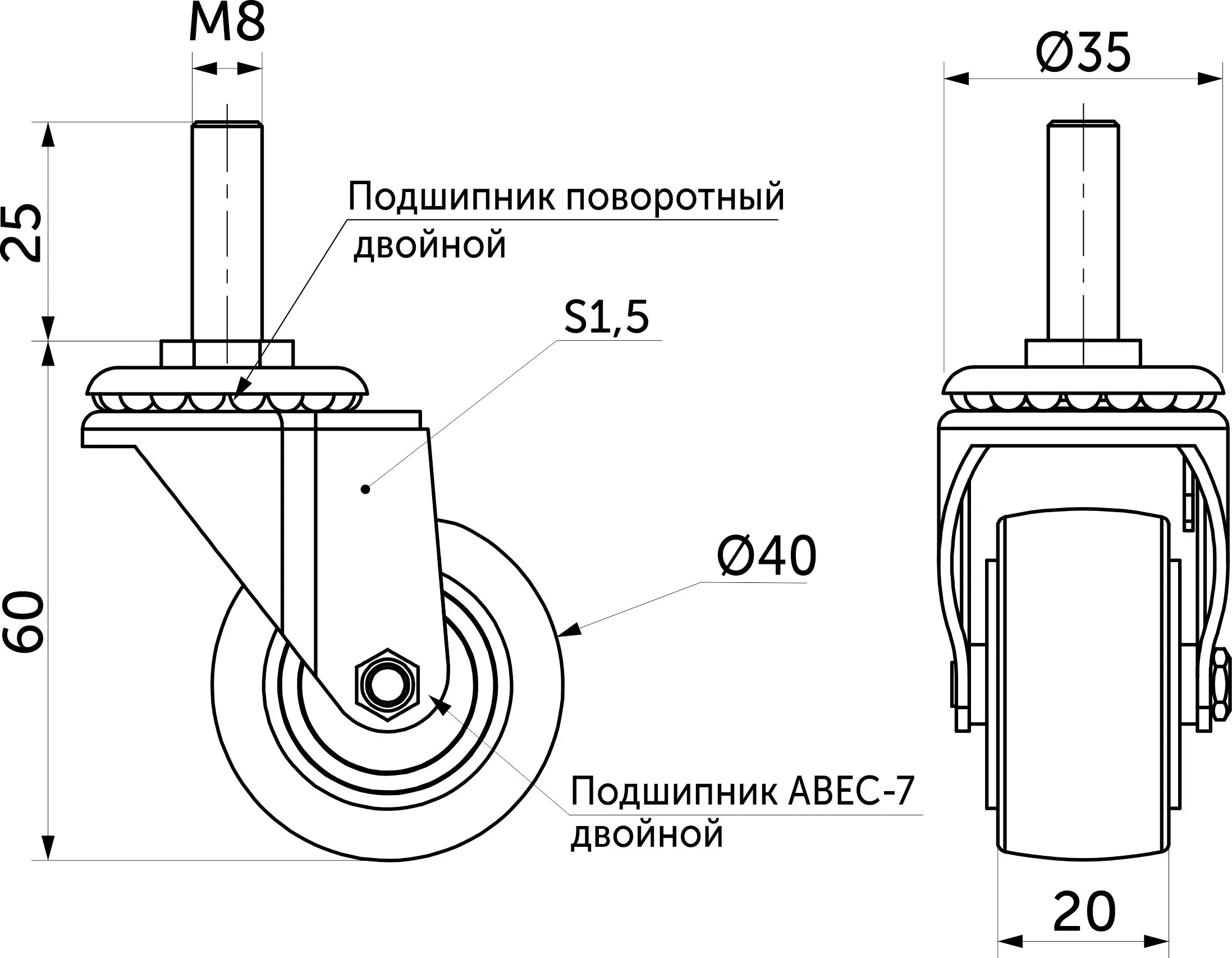 Диаметр колеса 40 мм, без тормоза.