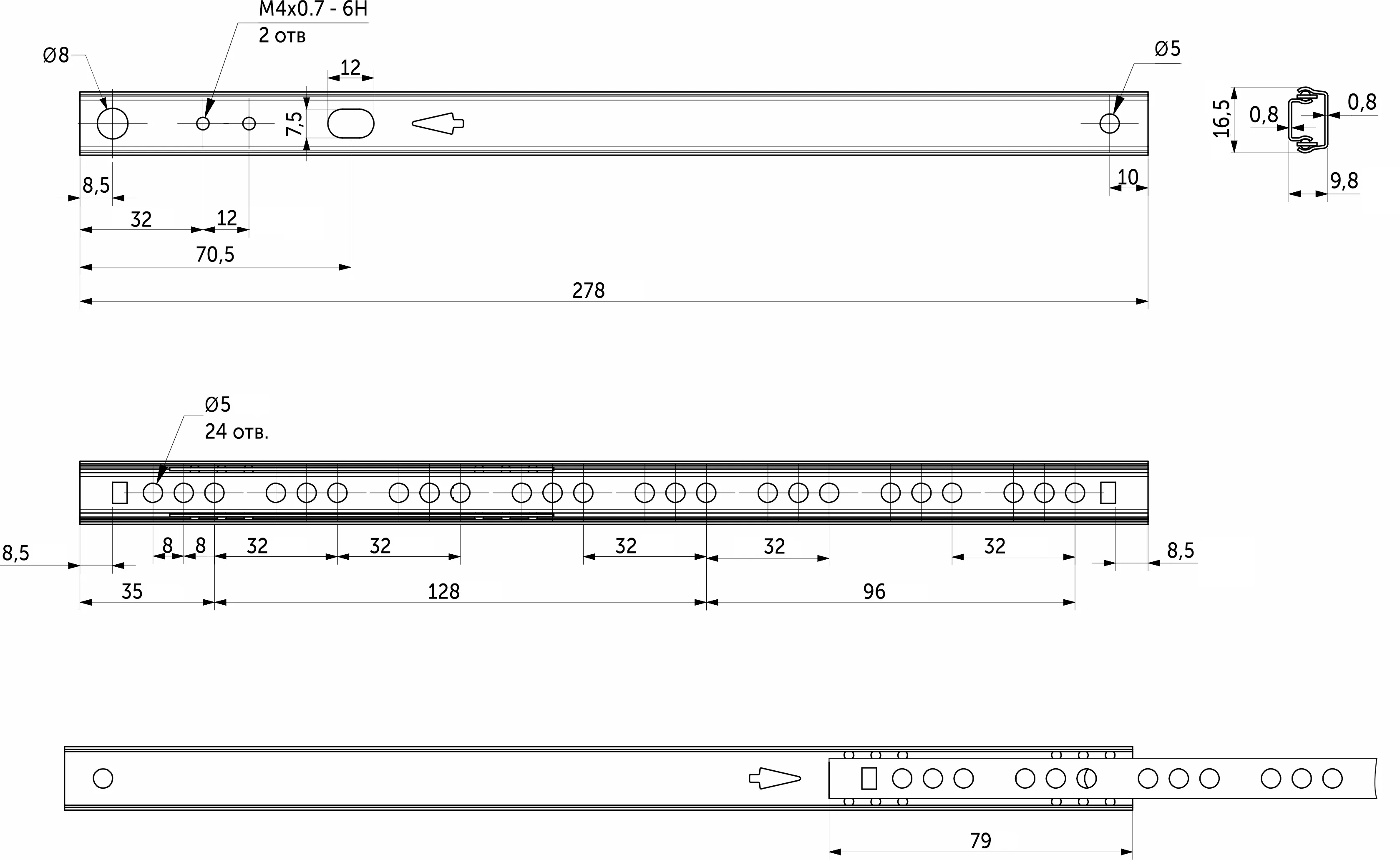 Комплект направляющих длиной 278 мм способен выдерживать нагрузку до 8 кг.