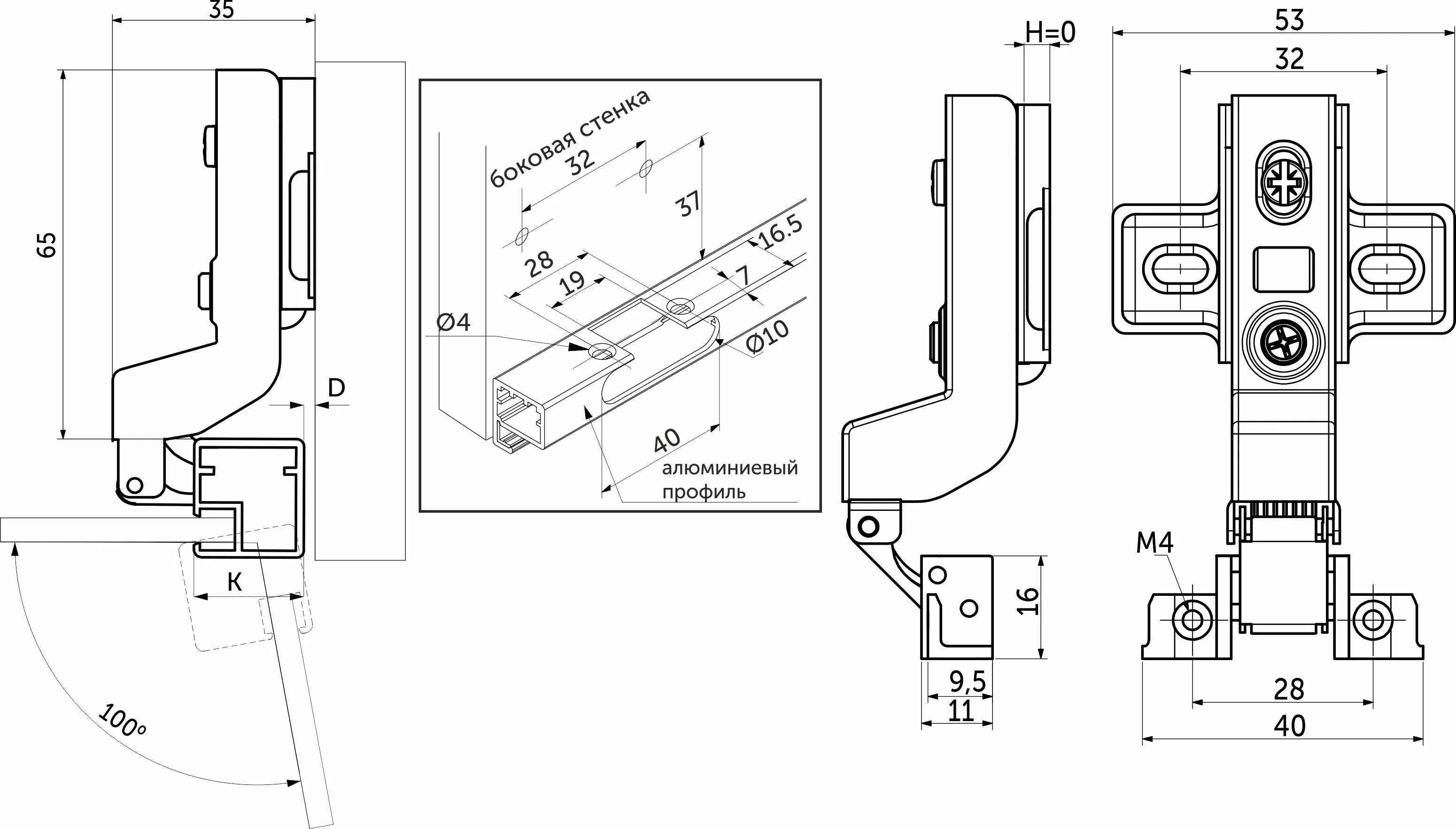| Угол открывания, ° | 100 |