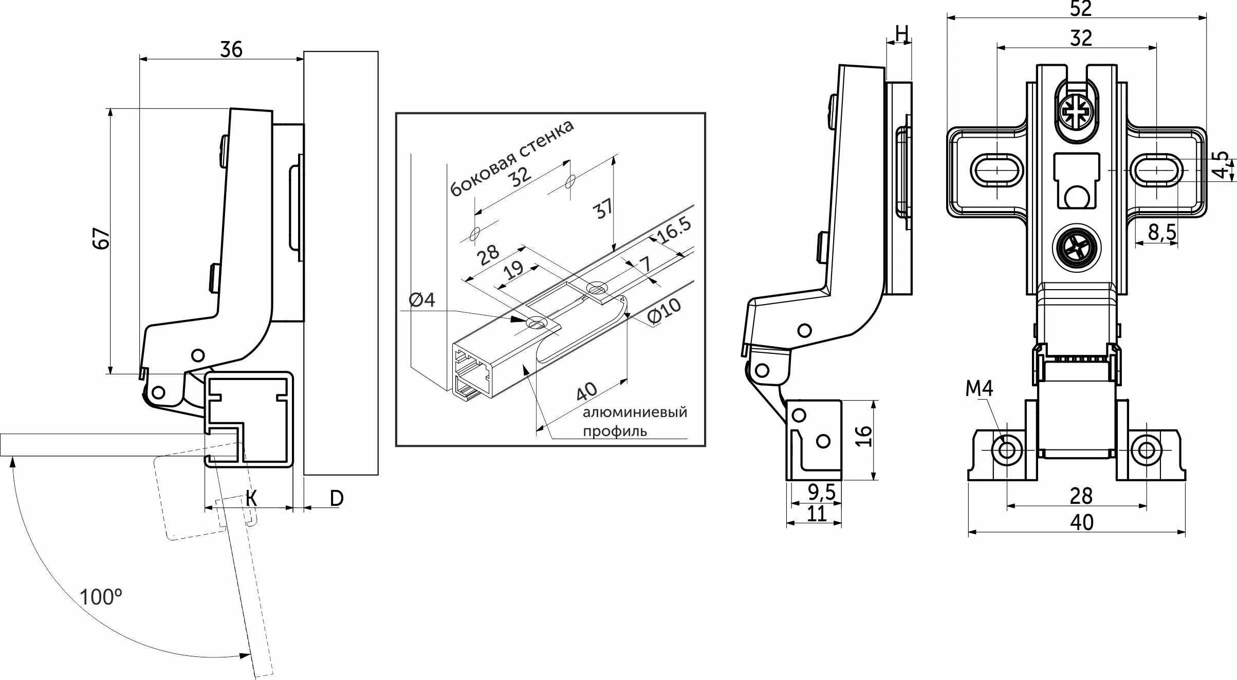 | Угол открывания, ° | 100 |