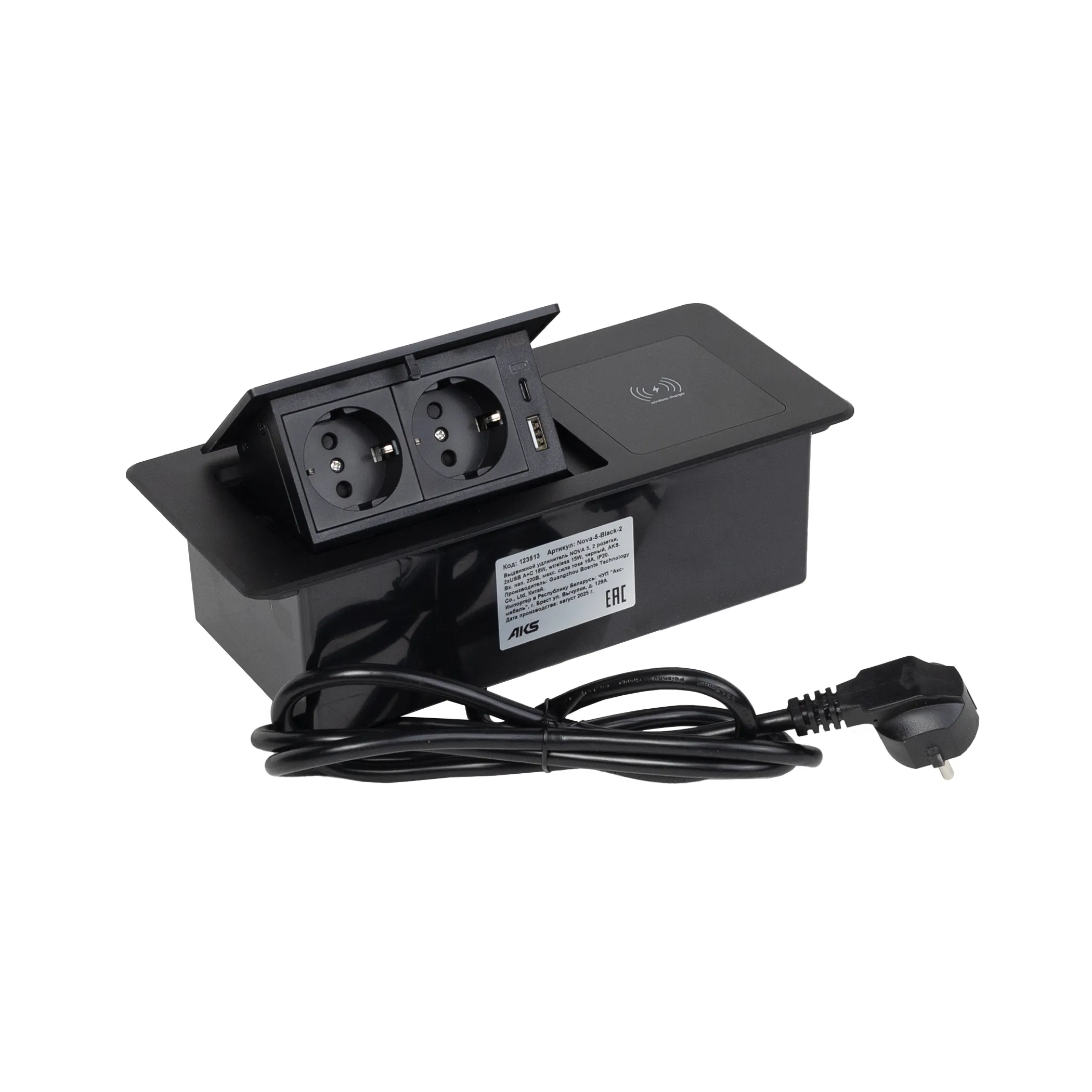 Выдвижной удлинитель Nova 5, 2 розетки, USB A + C, беспроводная зарядка, черный, AKS