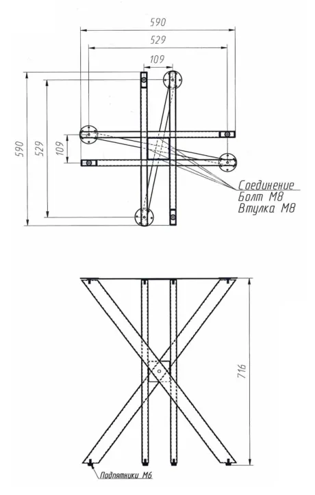 Комплектация подстолья: опора - 4 шт., подпятник М6 - 4 шт., царга - 2 шт., площадка - 4 шт., узел крепления - 1 компл., соединение царги - 1 компл.