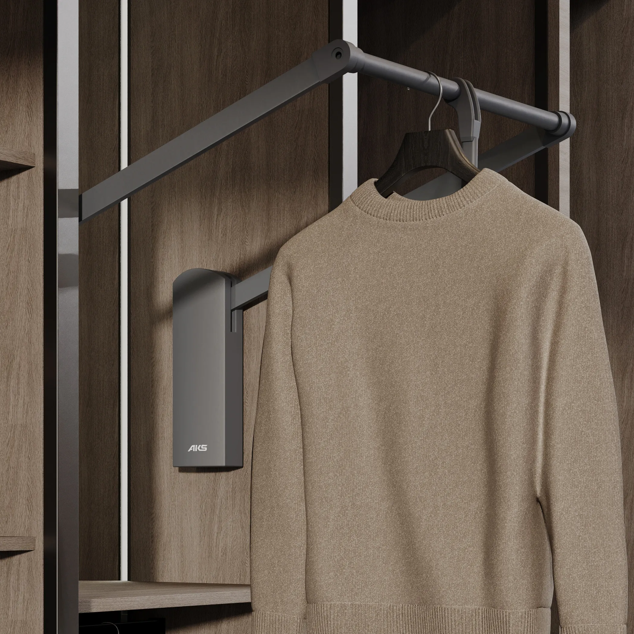 Пантограф VENTO помогает эффективно организовать хранение одежды в верхнем пространстве шкафа или гардеробной комнаты, максимально и с комфортом использовать труднодоступные зоны.