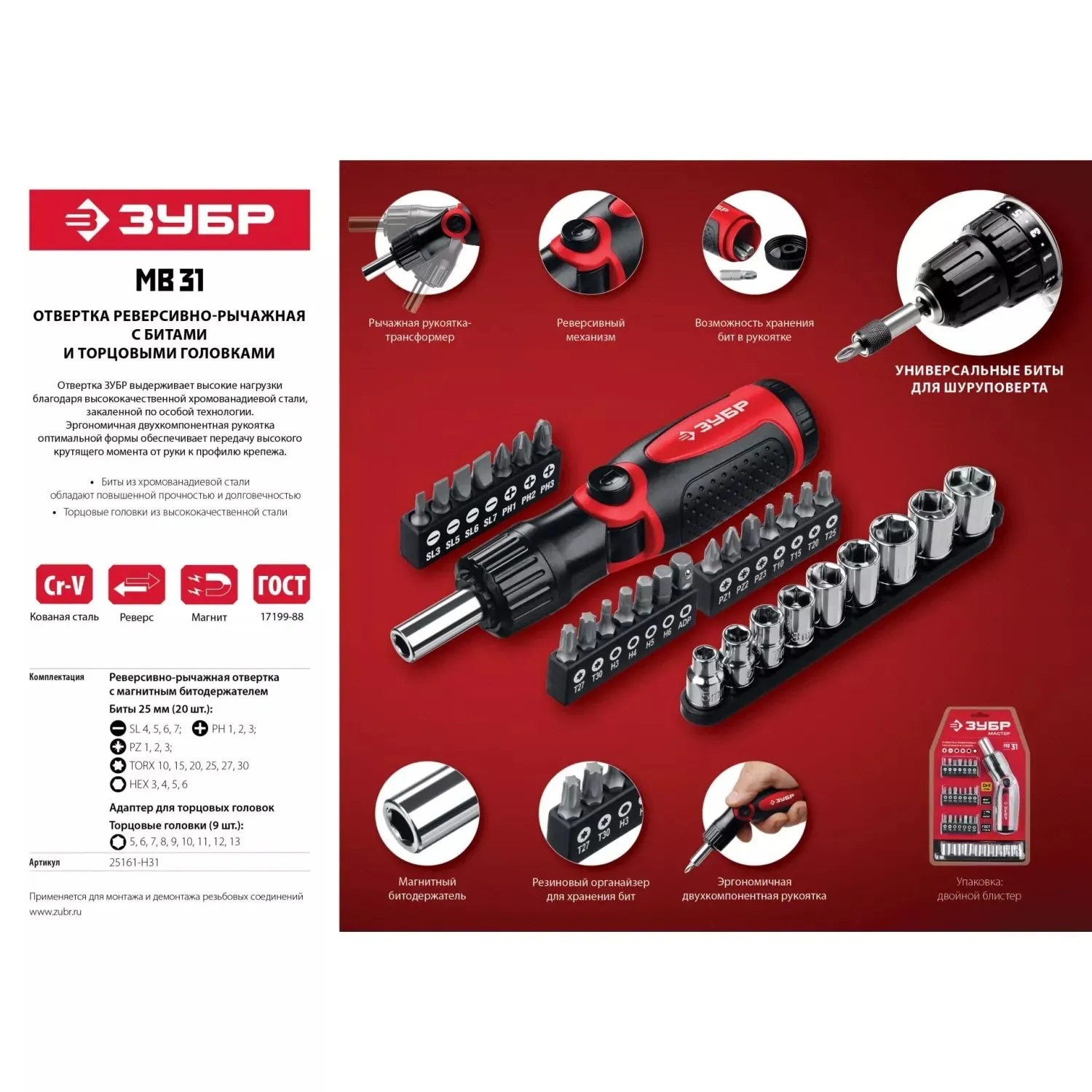 Отвертка реверсивно-рычажная с насадками МС ЗУБР