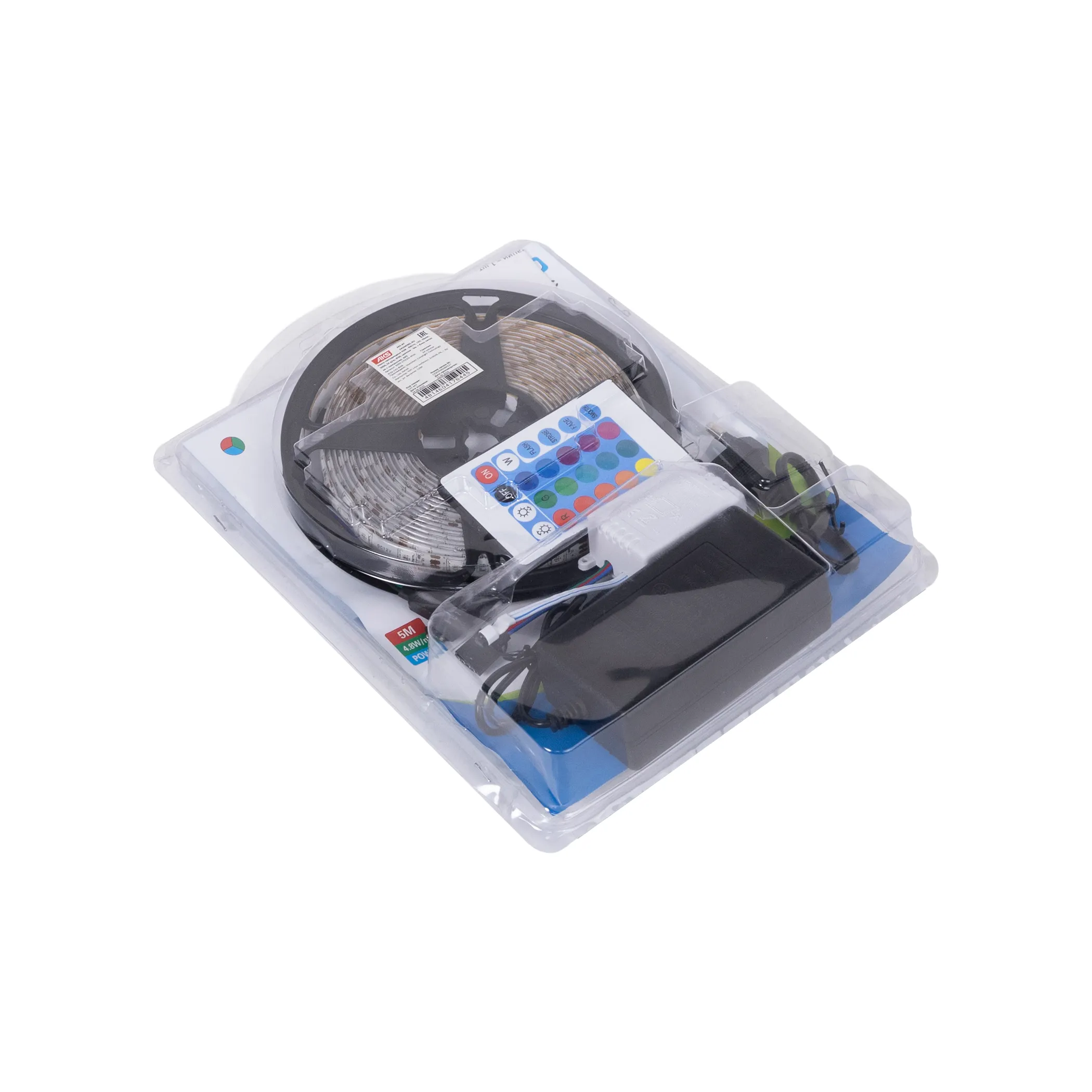 Лента светодиодная RGB влагостойкая - 4,8W/m, 12V, 10мм, 5050, 54 д/м, IP65, цветная - 5м, + блок питания + контроллер, AKS