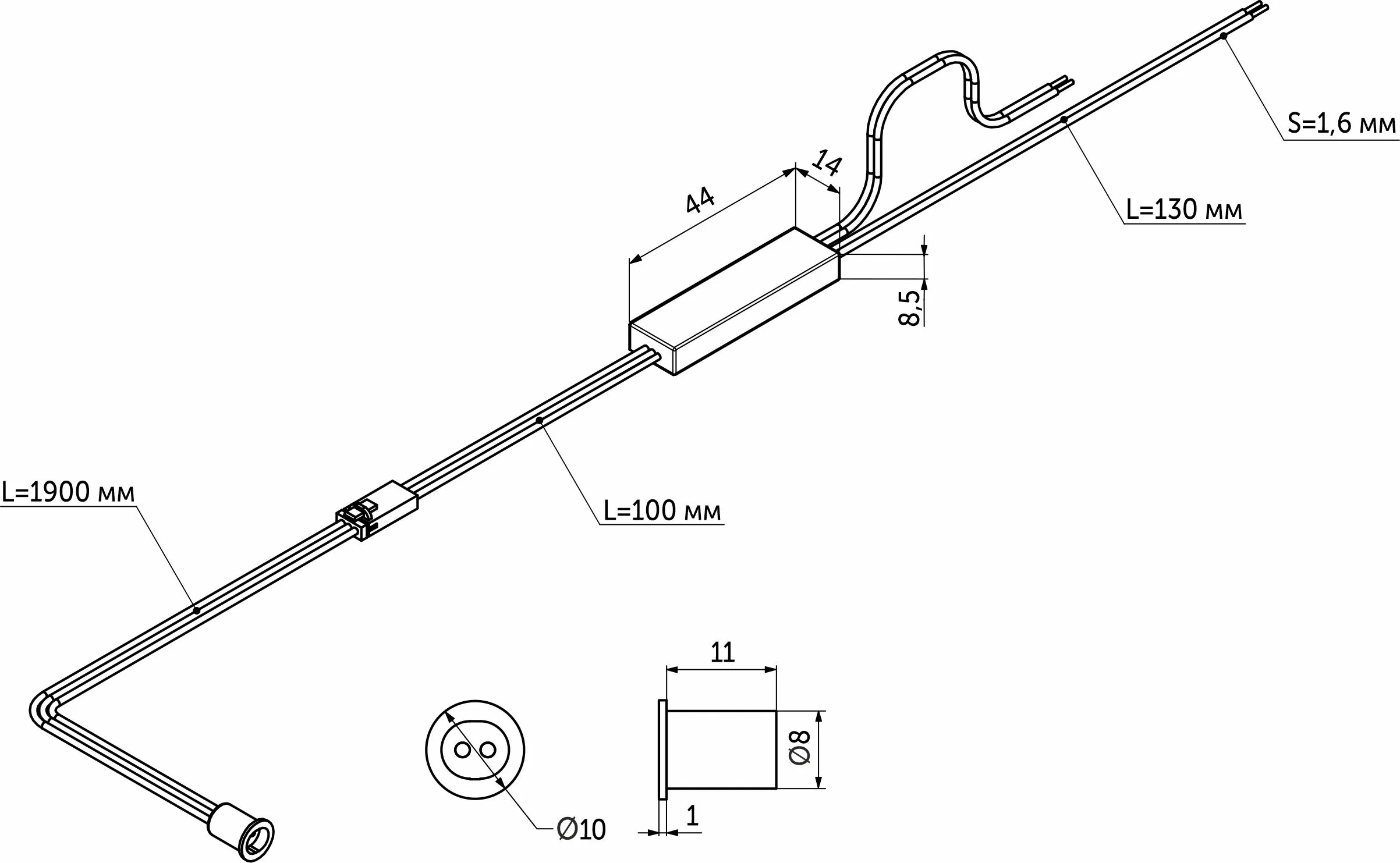 Выключатель имеет оголенные провода на конце провода для подключения подсветки.