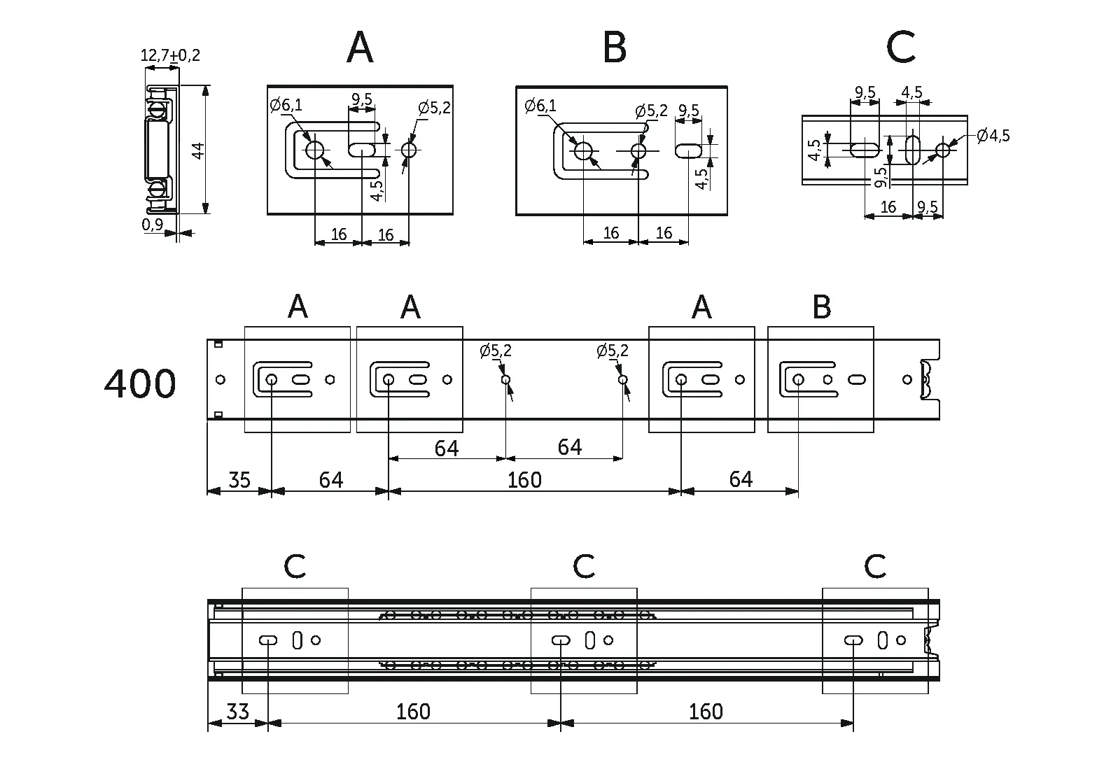 Направляющая для мебели AKS изготовлена из холоднокатаной стали толщиной 0,9*0,9*1,0 мм, имеет резиновый фиксатор от самопроизвольного открытия. Фактическая высота данной направляющей 45 мм, а её длина – 400 мм.