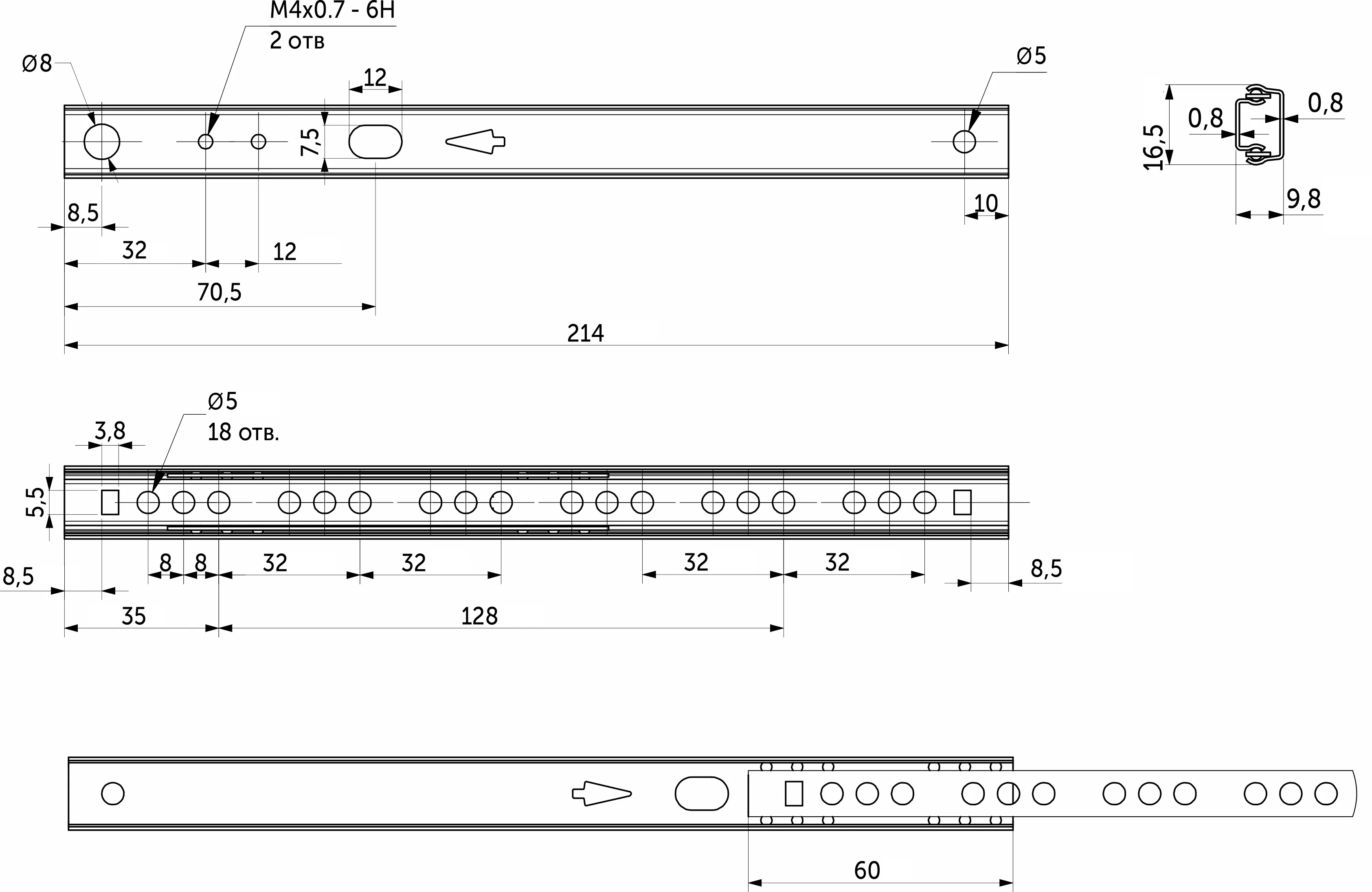 Комплект направляющих длиной 214 мм способен выдерживать нагрузку до 8 кг.