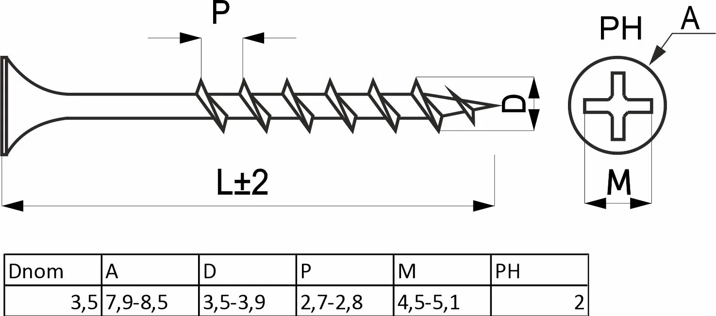 Саморез для гипсокартона для крепления к дереву имеет крупный шаг резьбы и шлиц PH.