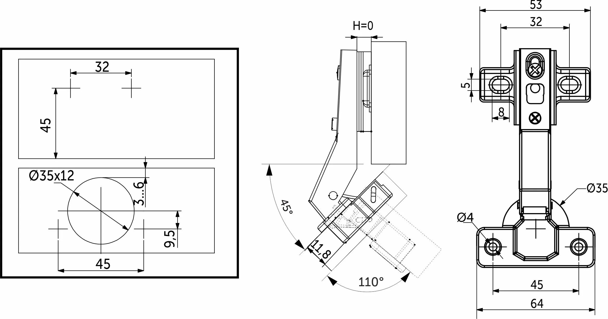 Петля угловая с доводчиком и системой быстрого монтажа clip on. Чашка 35 мм. Межцентровое расстояние в чашке 45 мм. Петля для мебели изготовлена из высокопрочной холоднокатаной стали. Имеет встроенный демпфер, что обеспечивает плавность закрытия петли. Угол открывания 110 градусов. Устанавливается преимущественно под скошенные фасады угловых ящиков. Петля регулируется в трех плоскостях винтами и позиционированием крепления планки петли к корпусу.