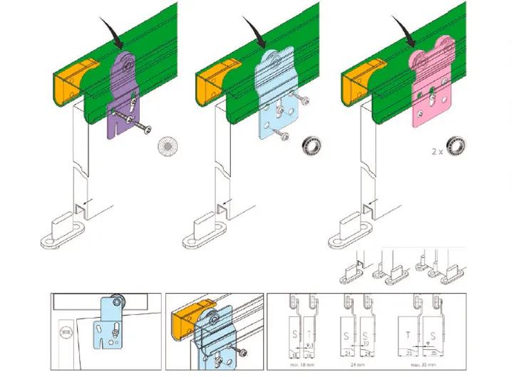 Двери без порога на одной шине, с подшипником, колесико из пластика. Для полотна 16-35 мм, максимальная нагрузка на комплект 50 кг.