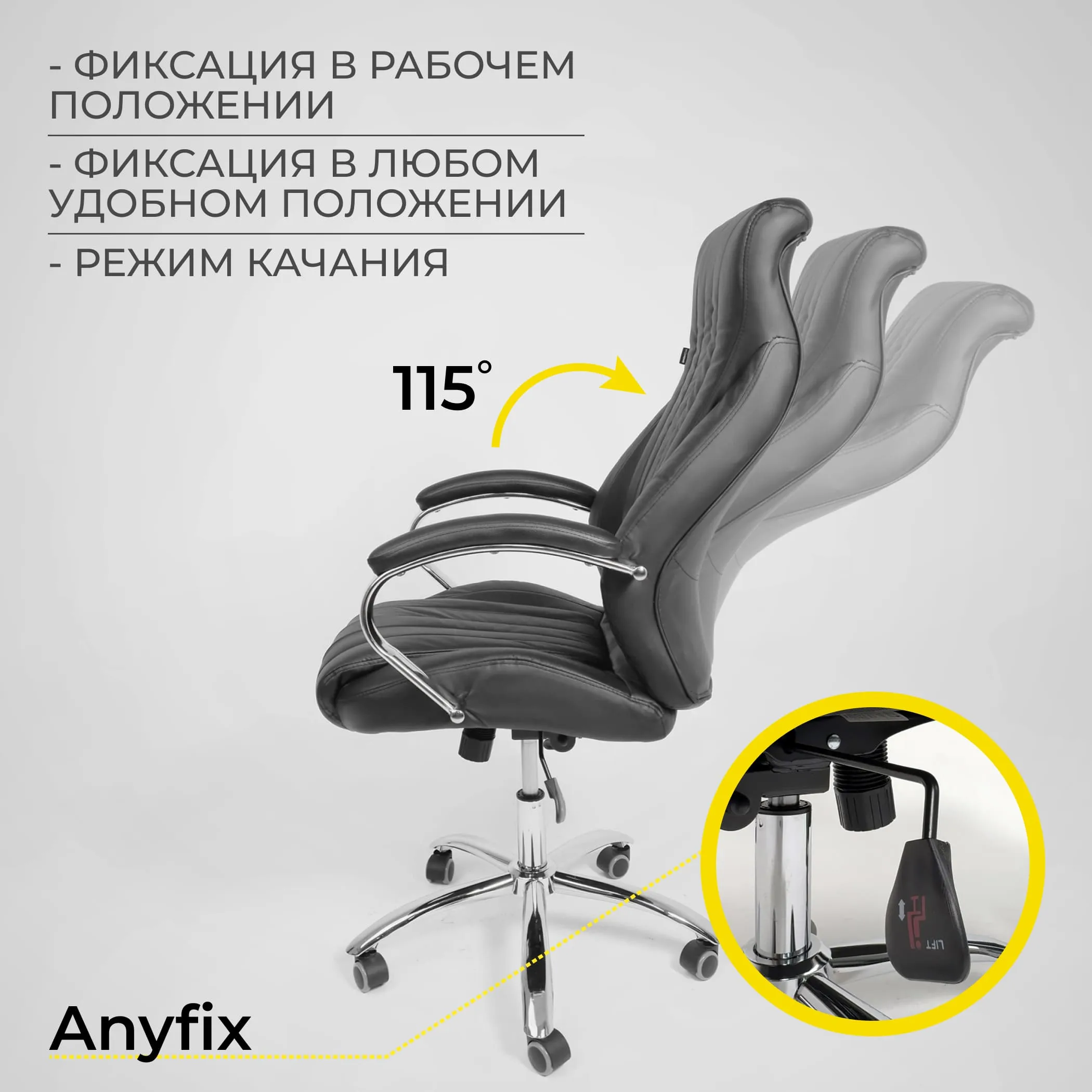 | Механизм регулировки | Anyfix Anyfix - механизм имеет два рычага - один справа, второй слева. Один рычаг отвечает за поднятие и опускание кресла, второй рычаг - за само качание кресла. Cуперкомфортная посадка благодаря возможности принять удобный угол посадки и увеличенной амплитуде качания. |