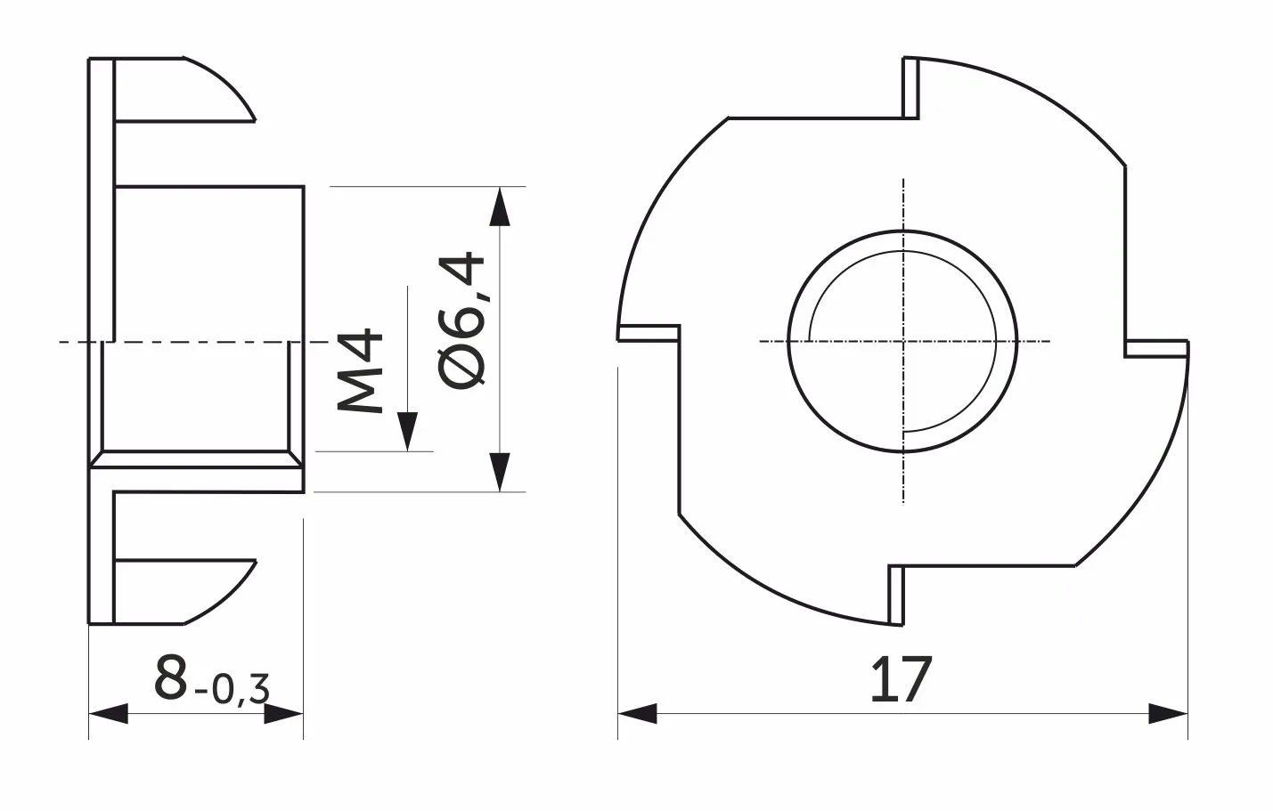 Гайка усовая (носковая, врезная, забивная, крыльчатая, T-nut, DIN 1624) предназначена для соединения деревянных элементов с использованием крепежных деталей с наружной метрической резьбой.