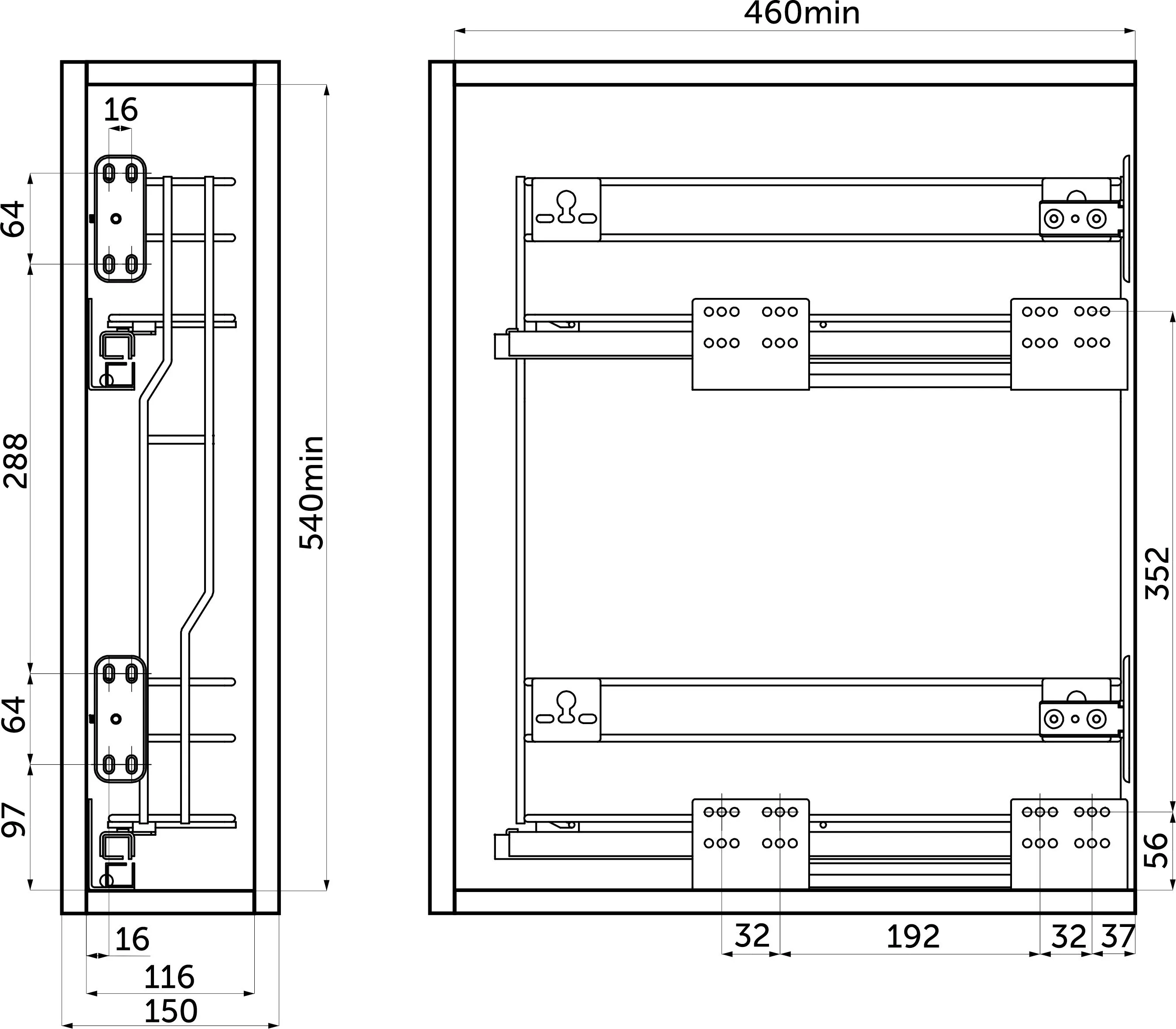 Карго бокового крепления. Крепятся к боковой стенке ящика. Для монтажа необходимо приобрести направляющие: левые код , правые код . Левые направляющие крепятся на левую стенку ящика, правые - на правую. Крепления к фасаду будут находиться в коробке с направляющими.
