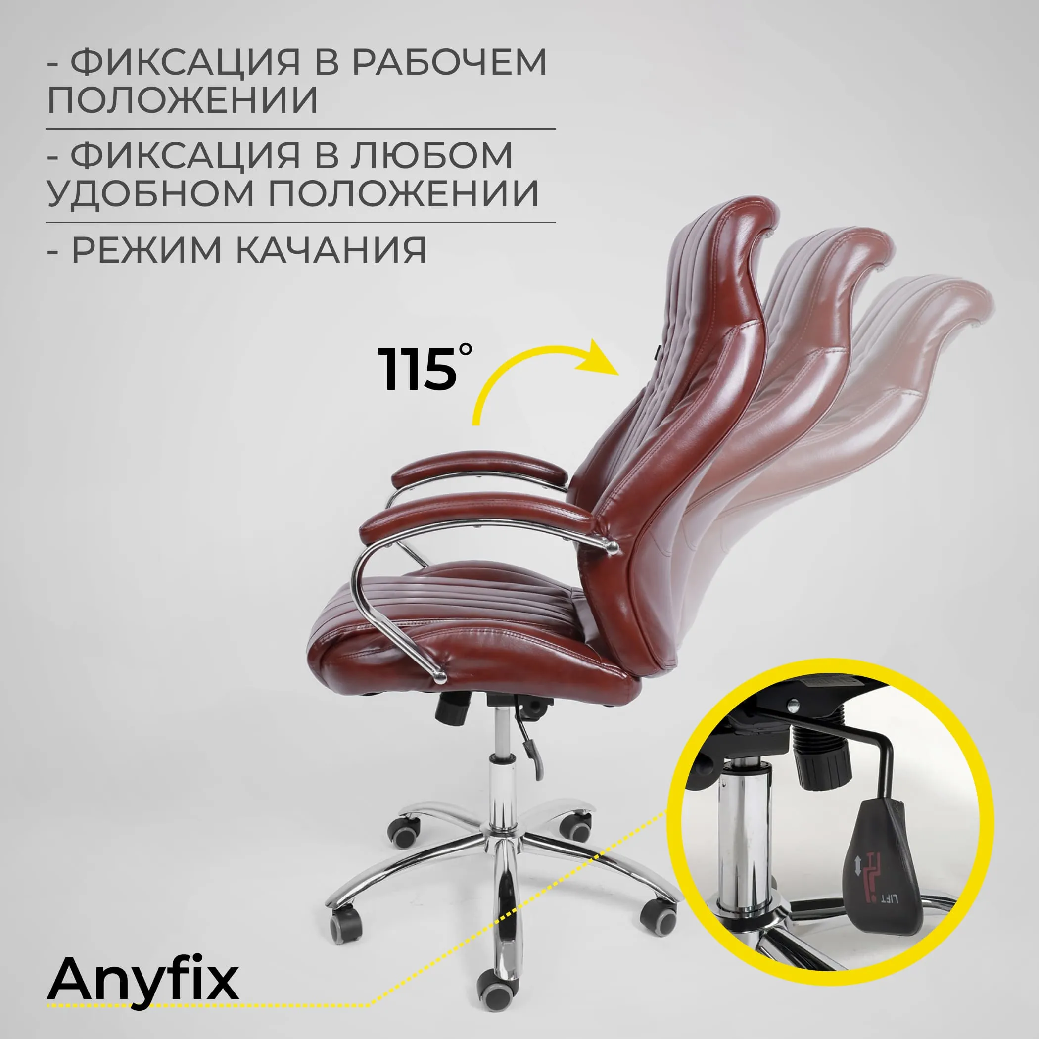 | Механизм регулировки | Anyfix Anyfix - механизм имеет два рычага - один справа, второй слева. Один рычаг отвечает за поднятие и опускание кресла, второй рычаг - за само качание кресла. Cуперкомфортная посадка благодаря возможности принять удобный угол посадки и увеличенной амплитуде качания. |