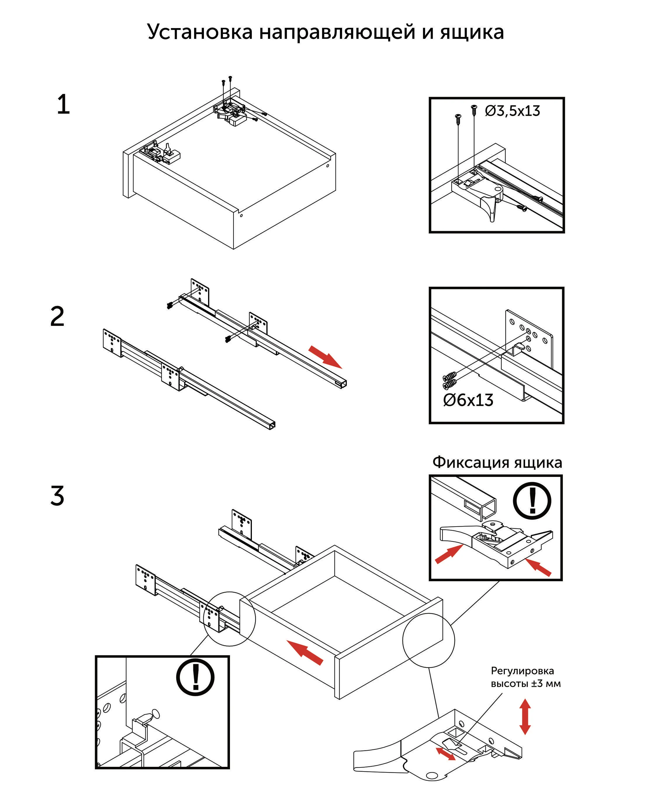 Направляющие скрытого монтажа предназначены для потайной (под ящиком) установки с минимальным зазором между стенкой корпуса и стенкой ящика (5 мм при использовании ДСП 16 мм). Направляющая выполнена из прочной холоднокатаной стали с ходом в полное выдвижение. Присутствует механизм доводчика и встроенная система синхронизации, что благоприятно сказывается при плавности хода на сверхшироких ящиках. Данные направляющие с гарантированной нагрузкой в 45 кг и циклом жизни в 100 000 открываний / закрываний. Предназначены для систем хранения в шкафах, кухонных гарнитурах и других изделиях, требующих высокий запас прочности. Подходят под все толщины материалов корпуса ящика до 16 мм включительно. Регулирование высоты фронта: + 3 мм.