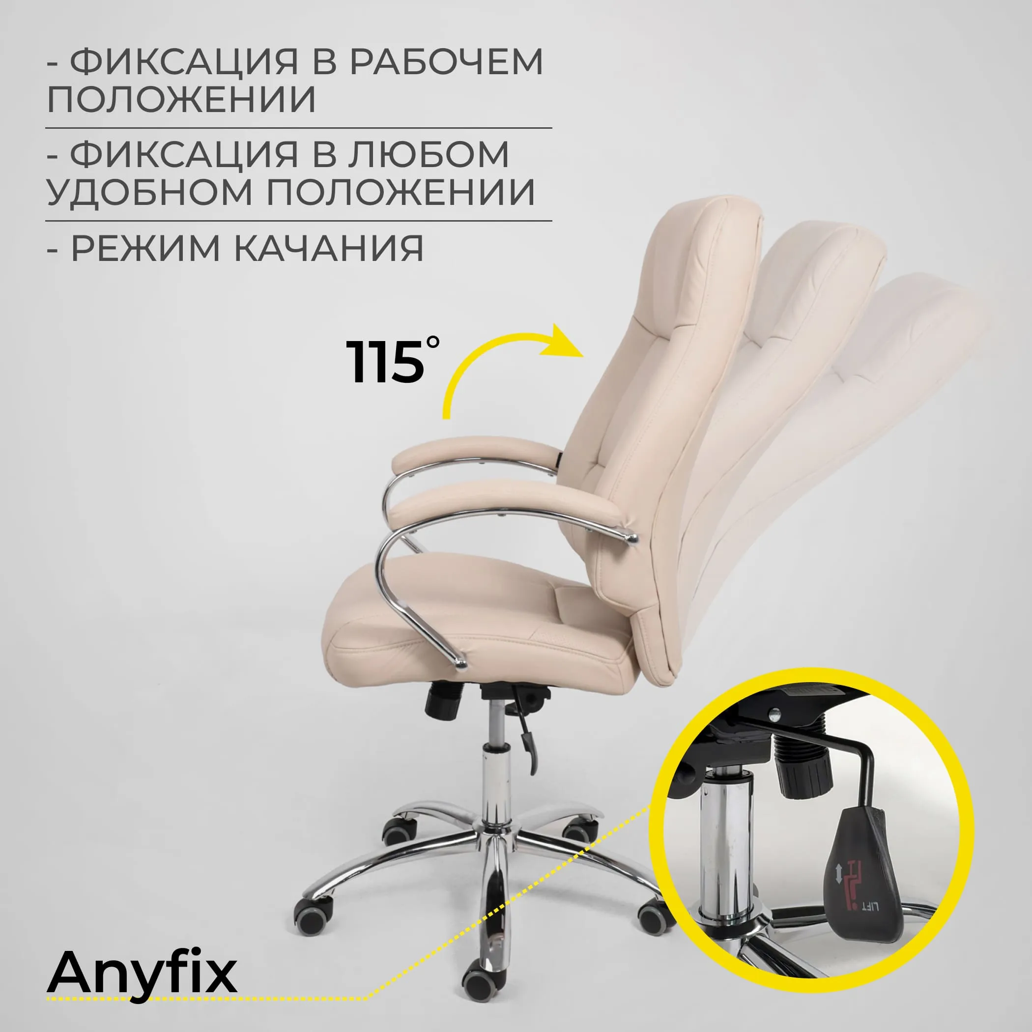 | Механизм регулировки | Anyfix Anyfix - механизм имеет два рычага - один справа, второй слева. Один рычаг отвечает за поднятие и опускание кресла, второй рычаг - за само качание кресла. Cуперкомфортная посадка благодаря возможности принять удобный угол посадки и увеличенной амплитуде качания. |