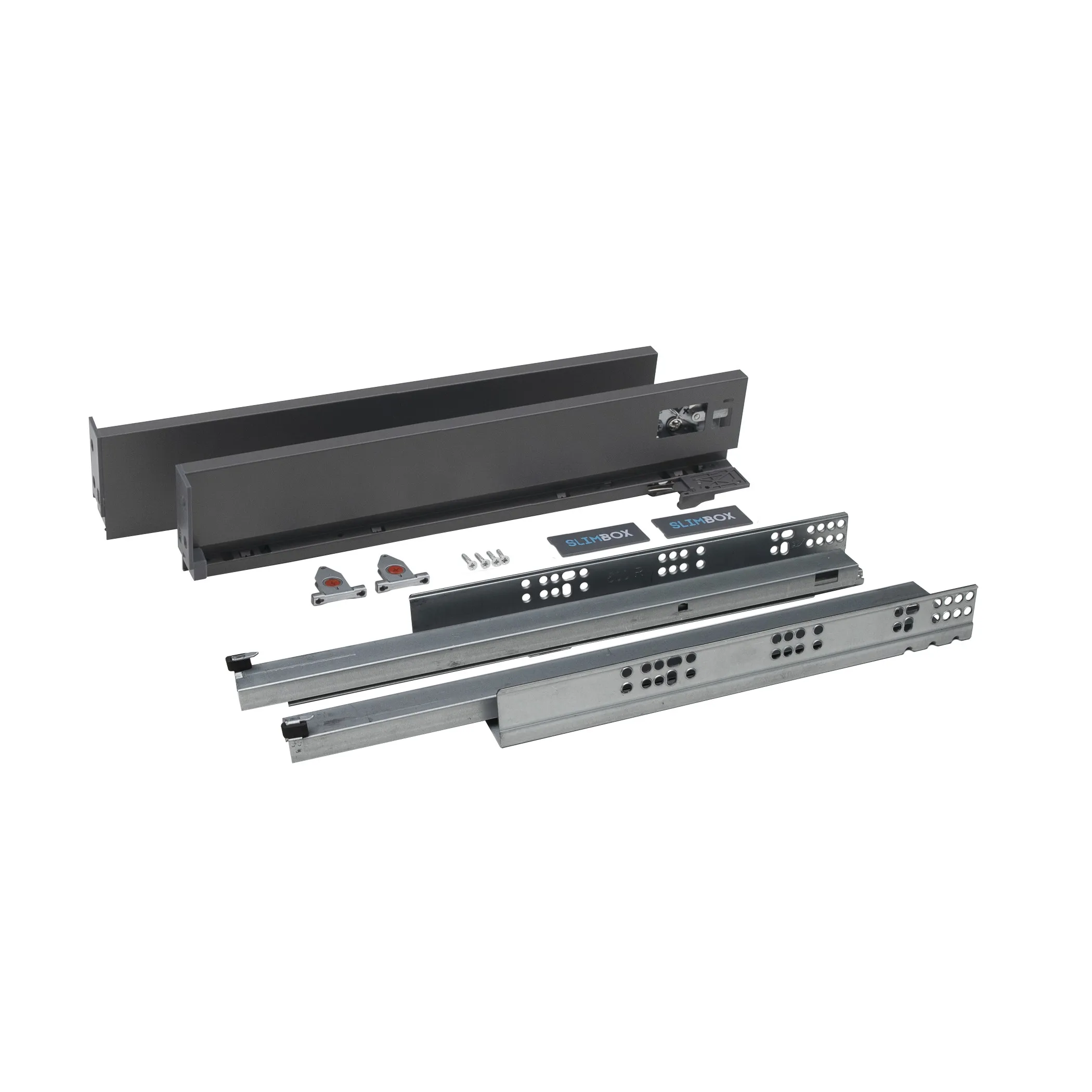 Slimbox с системой открытия от нажатия (push-to-open) представляет собой готовый комплект системы выдвижения с тонкими стальными боковинами. Толщина боковины в 13,5 мм позволяет увеличить полезное пространство ящика на 20%. Цвет: графит, высота ящика: 90 мм, длина направляющей: 350 мм.