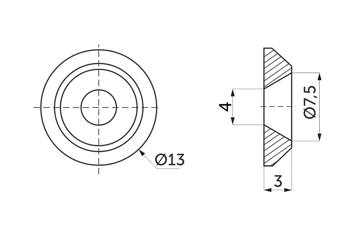 Она принимает функцию шайбы - увеличение площади прижима, что позволяет применить большее усилие затяжки, предохраняет поверхность скрепляемых деталей (конструкций) от повреждений (актуально для фасадов из стекла, металла и т.п.), а также увеличивает степень уплотнения соединения (в т.ч. может компенсировать излишнюю длину винта если фасад тонкий или глубина резьбы в ручке недостаточна). Наружный диаметр данного изделия - 13 мм.