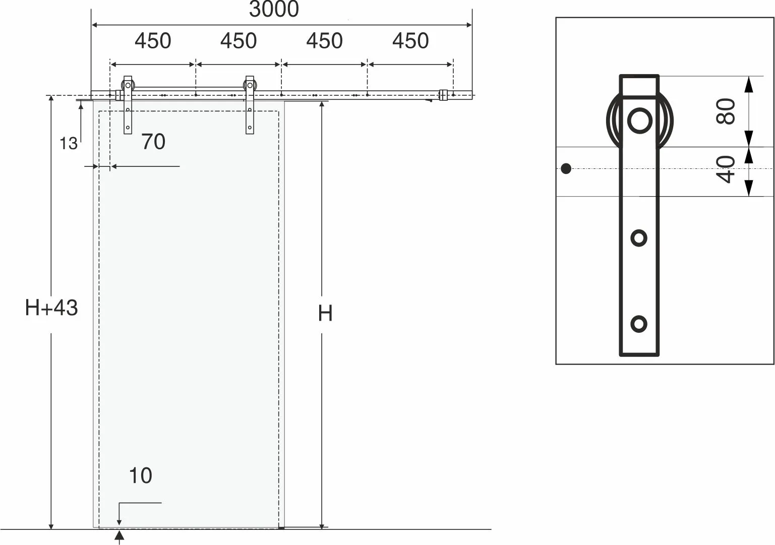 В комплекте: 2 ролика верхних, направляющая + 5 креплений, 2 ограничителя, 1 проводник, 2 нижних отбойника. Для плит 18-45 мм Ширина двери от 500 до 1000 мм