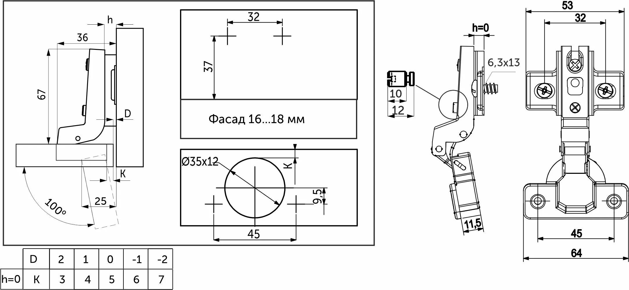 Петля предназначена для фасадов толщиной от 15 до 22 мм, имеет межцентровое расстояние между отверстиями в чашке в 45мм, а также высоту монтажной планки h0.