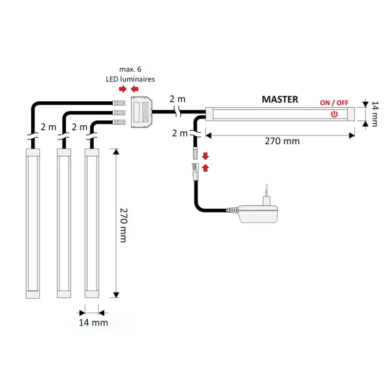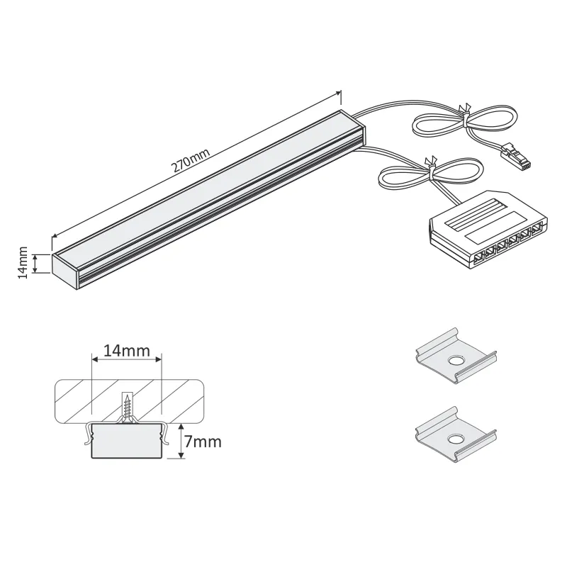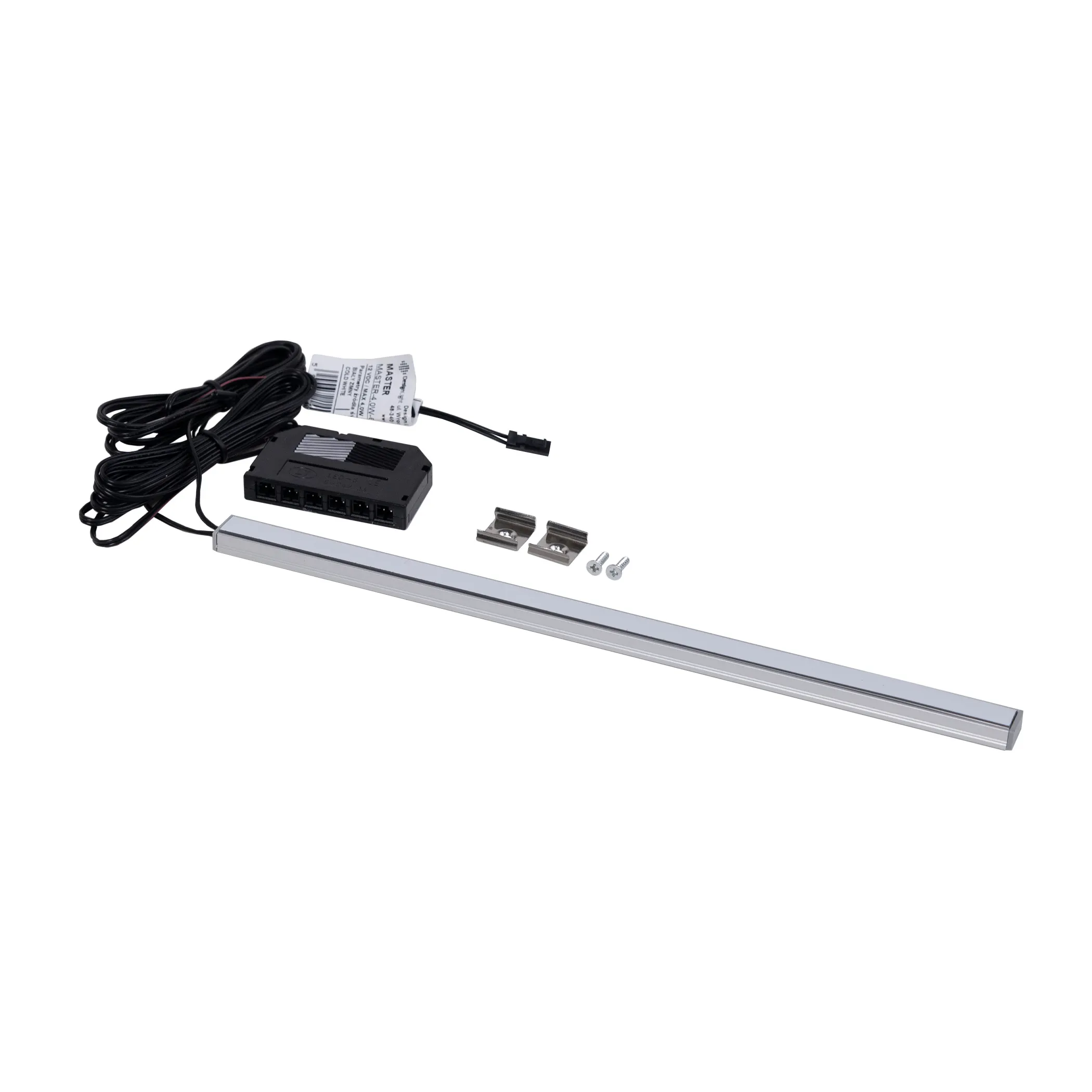 Светильник светодиодный, размеры 270х14х7, мощность 3,4Вт, с конектором на 6 выходов, свет холодный белый (6000К), 12 VDC, возможность параллельного подключения до 6 источников света.