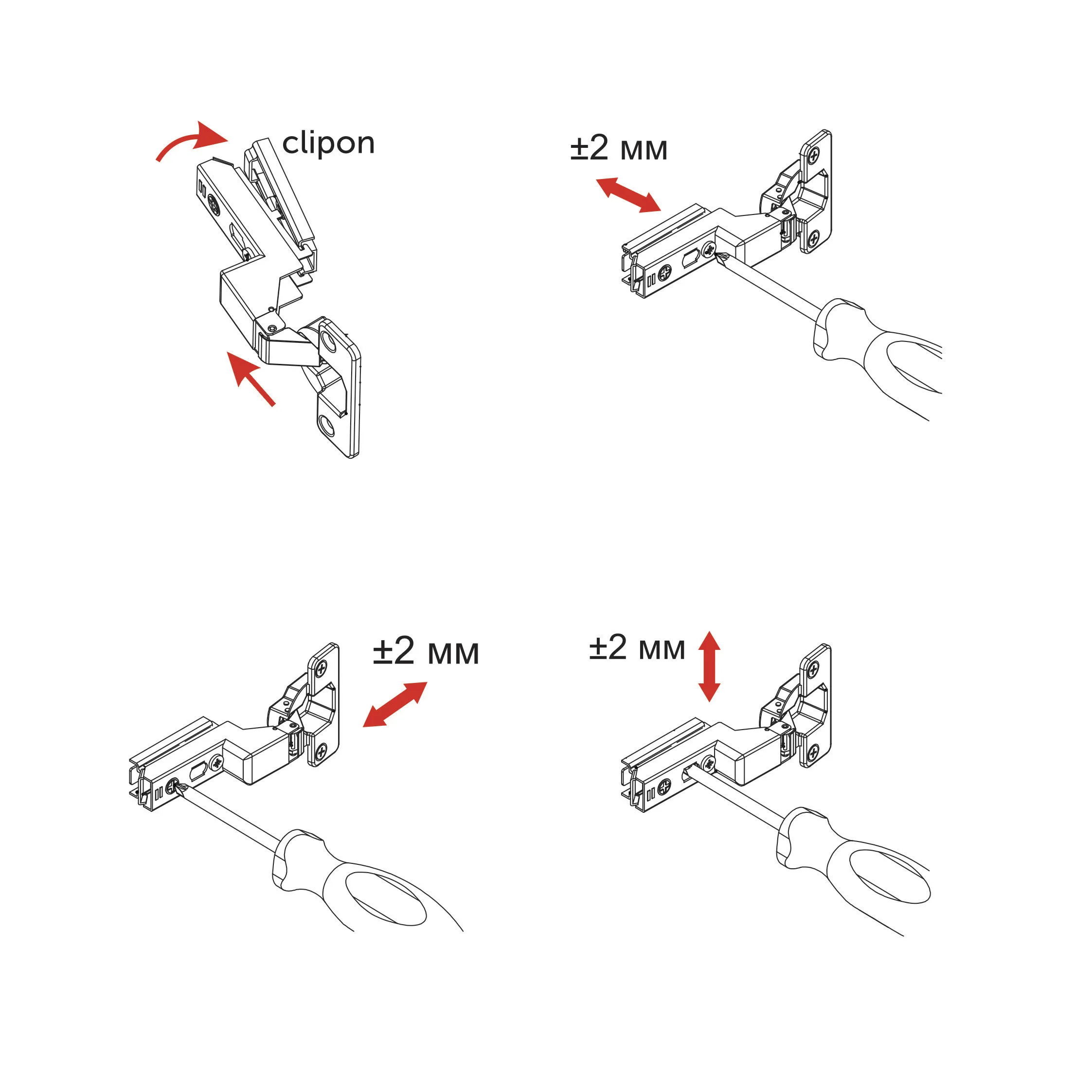 Петля внутренняя с доводчиком и системой быстрого монтажа clip on. Имеет современную систему регулировки в трех плоскостях по +/- 2 мм при помощи эксцентриковых винтов в планке и теле петли. Межцентровое расстояние в чашке 48 мм.