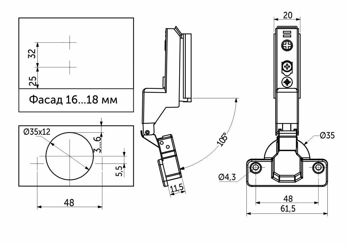 | Угол открывания, ° | 105 |