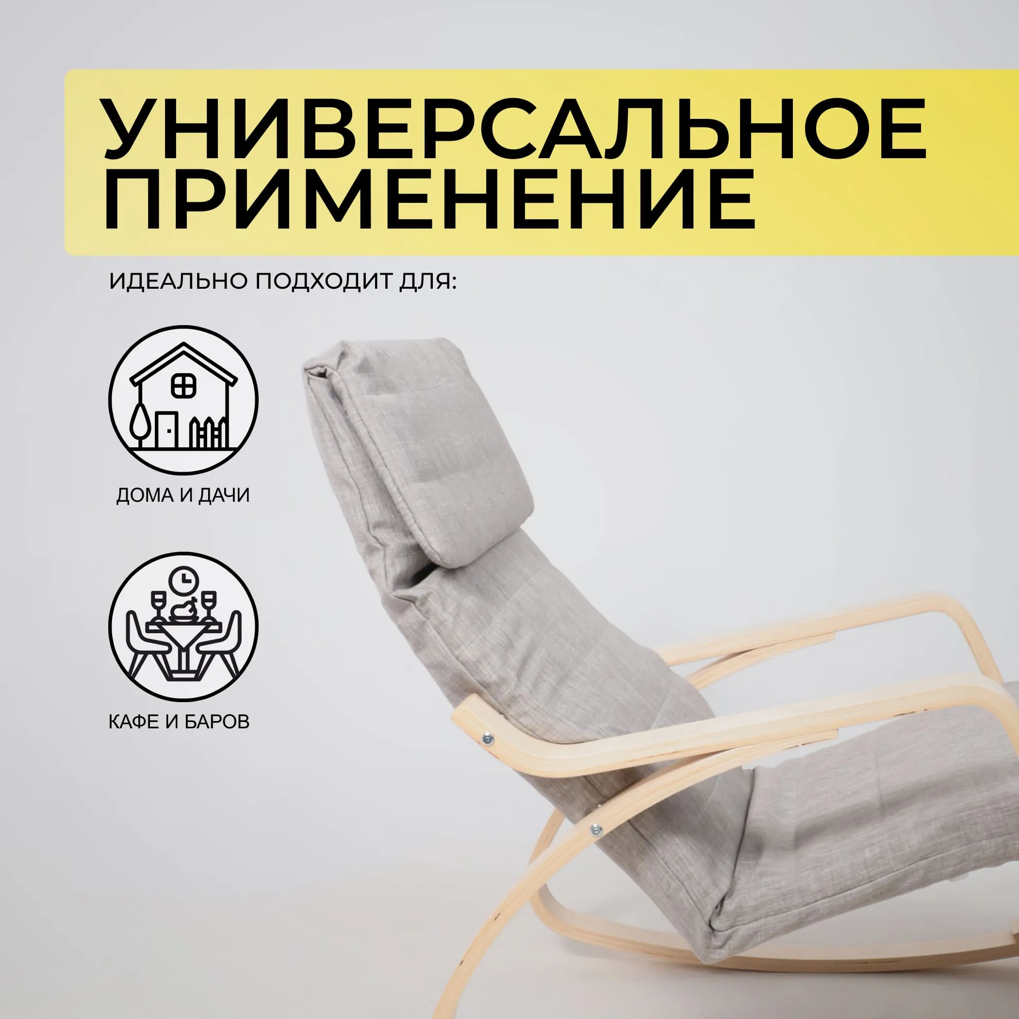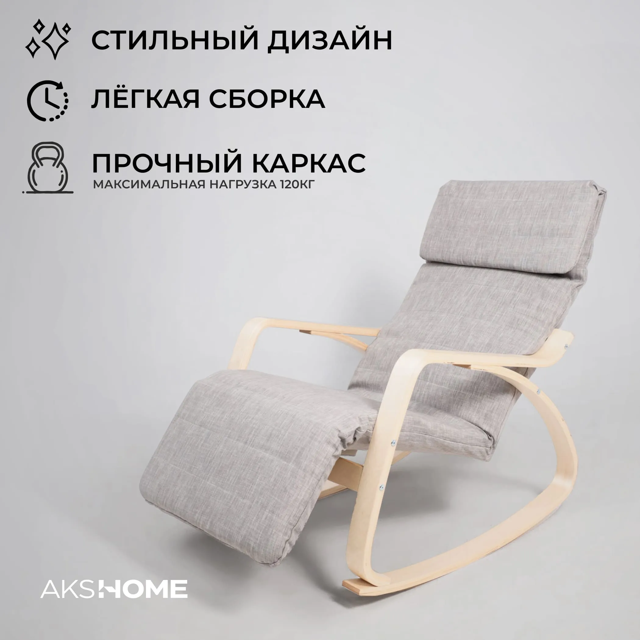 Кресло-качалка изготовлена из износостойкой ткани и натуральной древесины. Есть выступающий подголовик, и регулируемая подножка. Подойдет для дома, садовой зоны, а так же общественного места.
