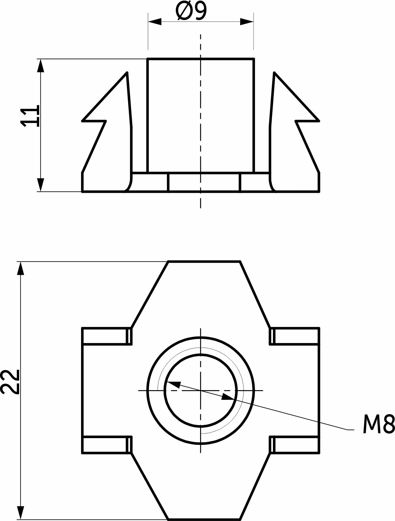 Гайка усовая (носковая, врезная, забивная, крыльчатая, T-nut, DIN 1624) предназначена для соединения деревянных элементов с использованием крепежных деталей с внутренней метрической резьбой.