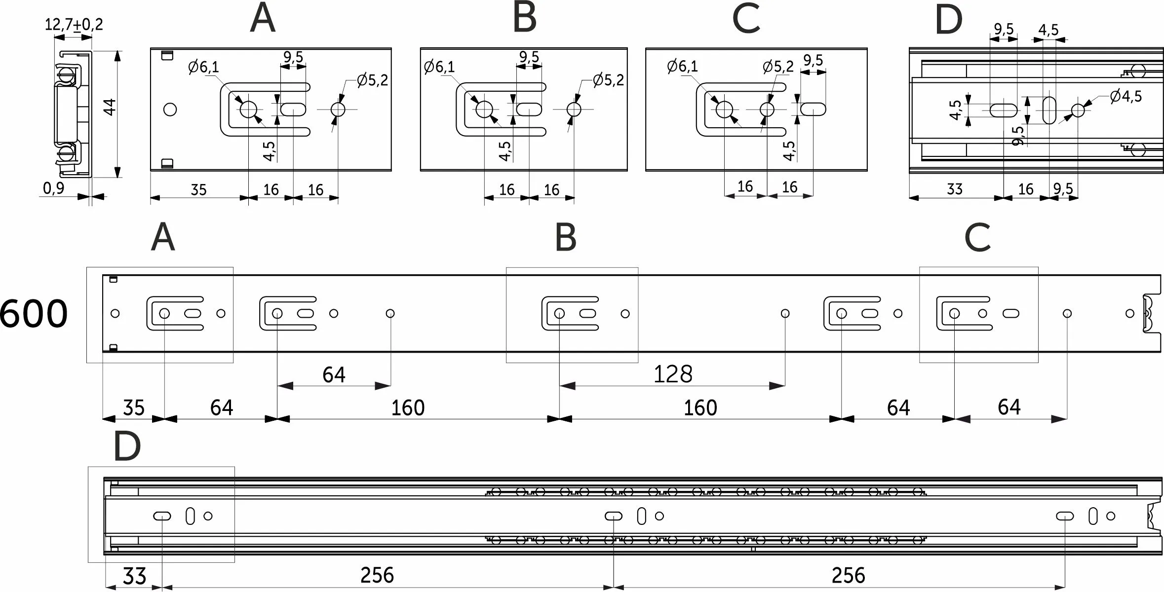Классическая направляющая с шарикоподшипниковым механизмом и телескопической структурой, обеспечивает полное выдвижение. Высота 45 мм. Нагрузка 35 кг. Изготовлена из холоднокатаной стали. Резиновый фиксатор от самопроизвольного открытия. Длина -600 мм. Толщины 1,0*1,0*1,2 мм (запас прочности -80000 циклов).
