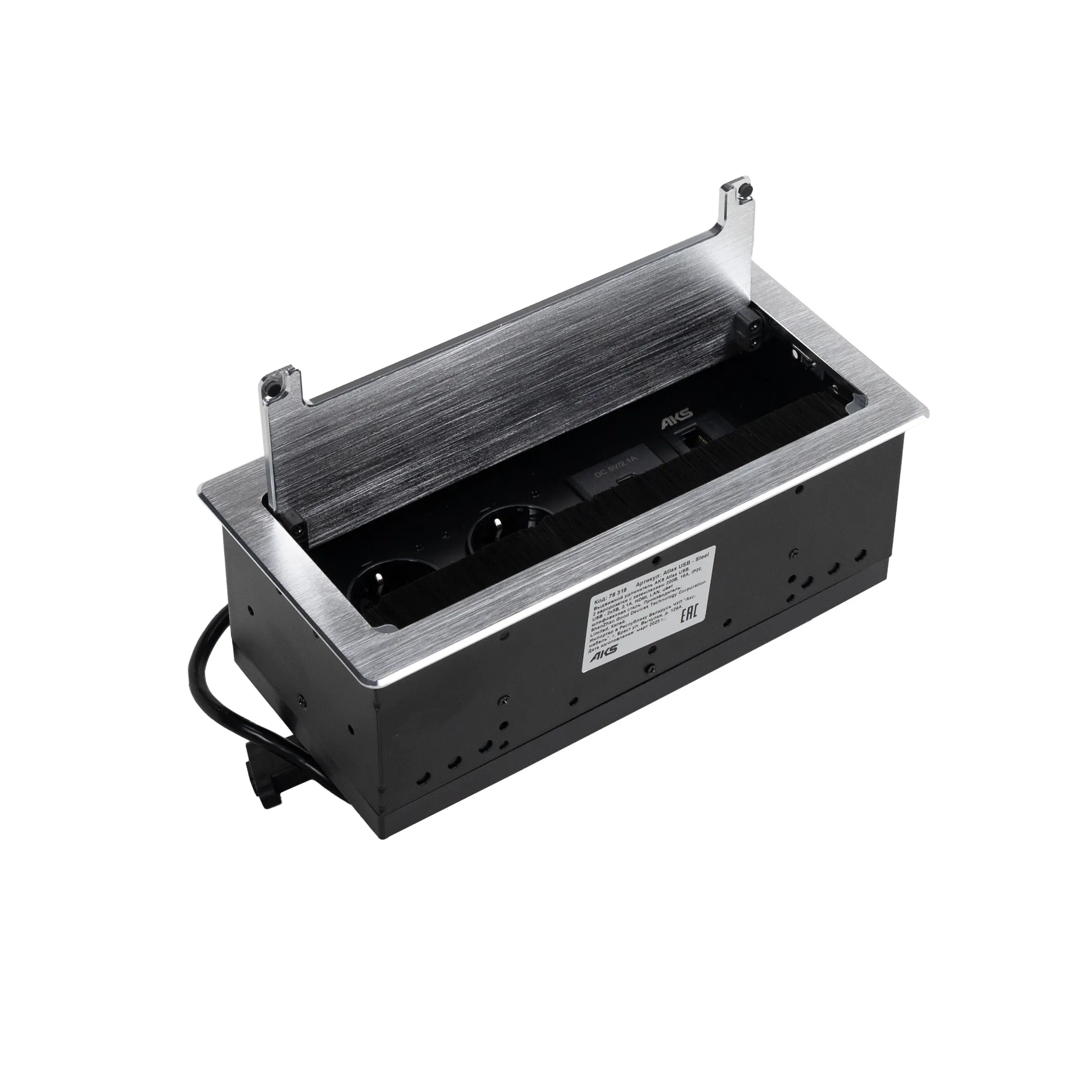 Выдвижной удлинитель Atlas USB, 2 розетки, USB A + C, HDMI, LAN, шлиф. сталь, AKS