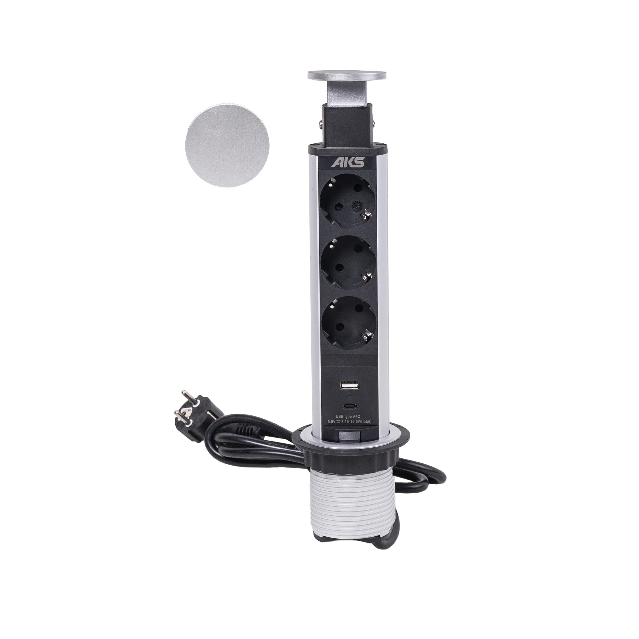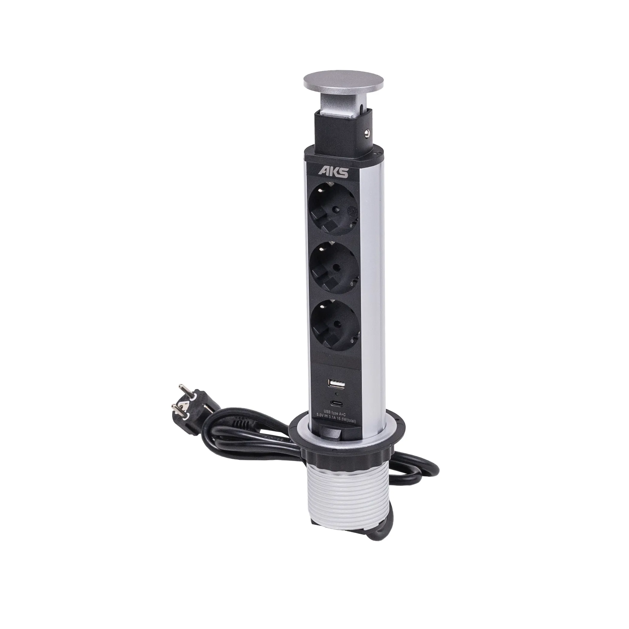 Выдвижной удлинитель Vulcan USB, 60 мм, 3 розетки, USB A + USB C, крышка пластик, алюминий, AKS