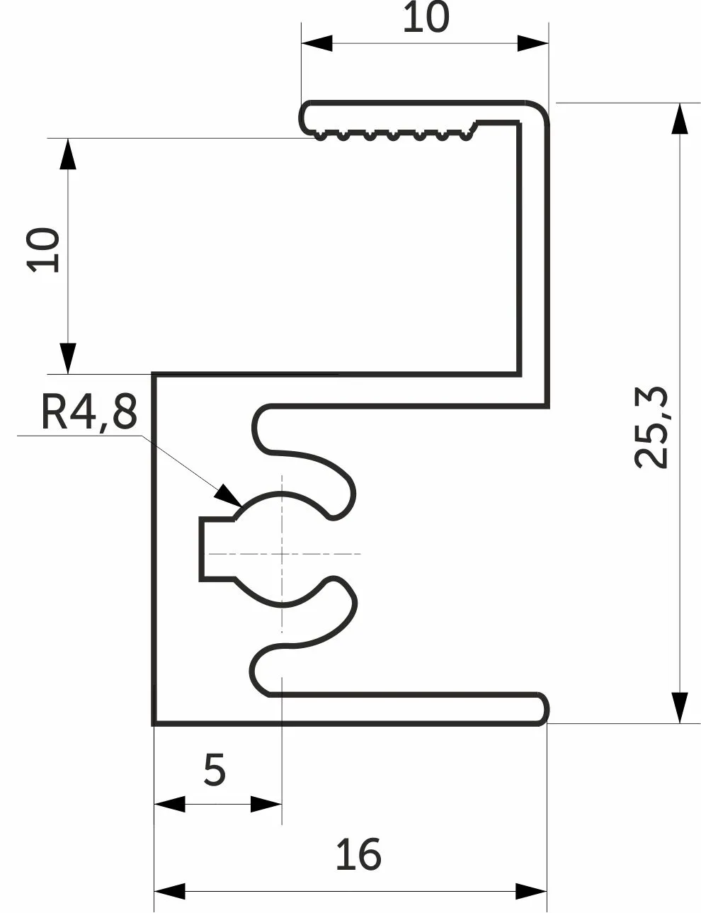 Материал: алюминий . L=6,0 м. Профиль соединяет между собой в верхней части двери дверное полотно и ролики. В специальный паз монтируются ролики, которые после устанавливаются в верхнюю направляющую.