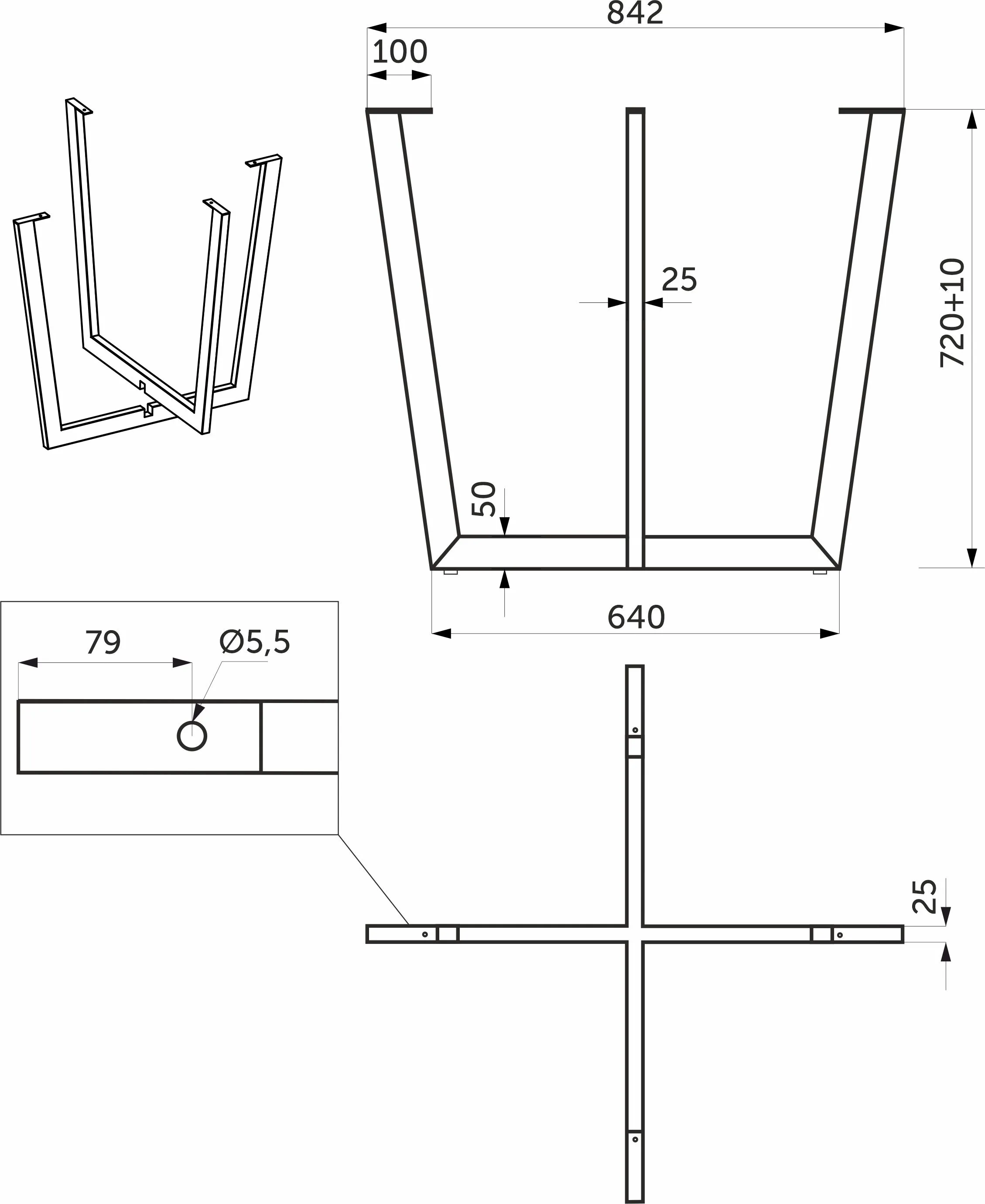 Подстолье изготовлено из металлического профиля 50*25мм. Толщина профиля 1,5мм.