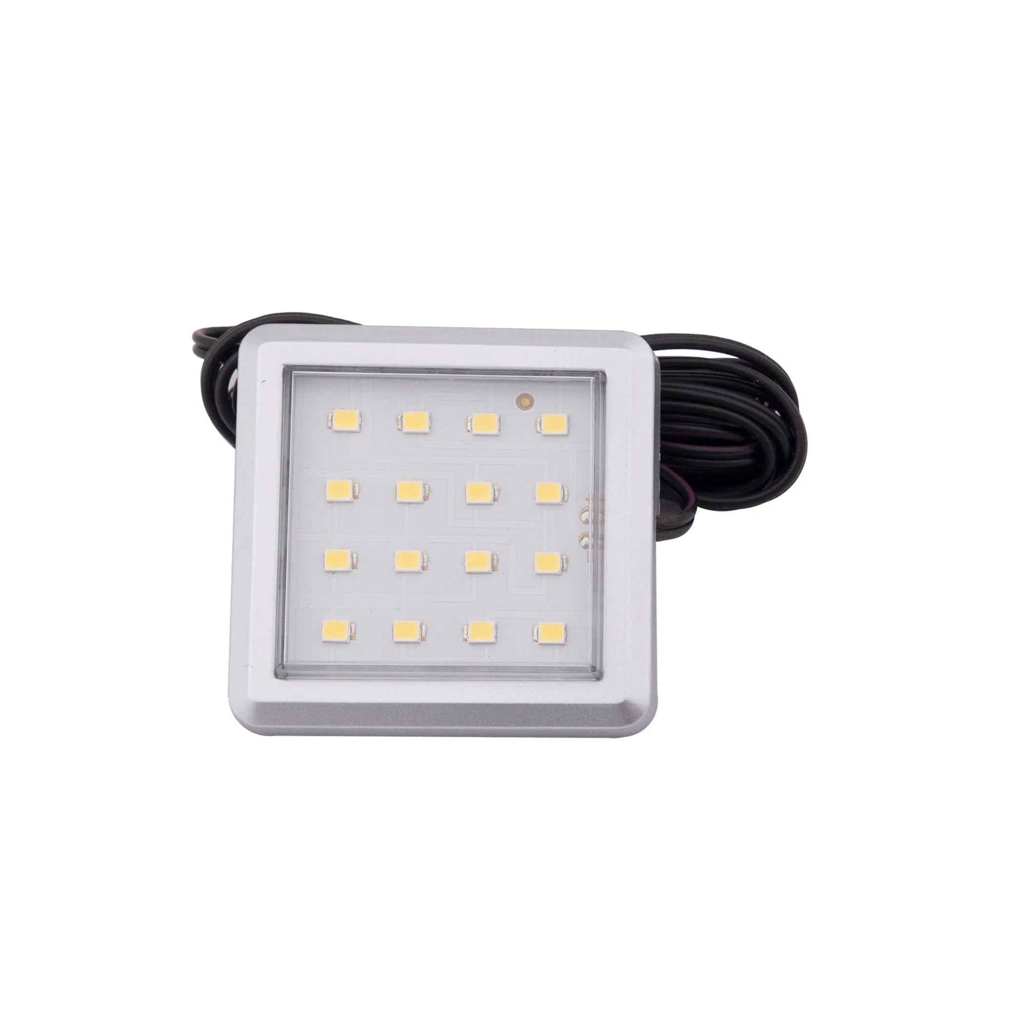 Светильник светодиодный, накладной, размеры 52х52x8мм, напряжение 12V постоянного тока, мощность 2W, степень защиты IP20, нейтральный белый 4000К, цвет хром, шнур с коннектором 1.5м