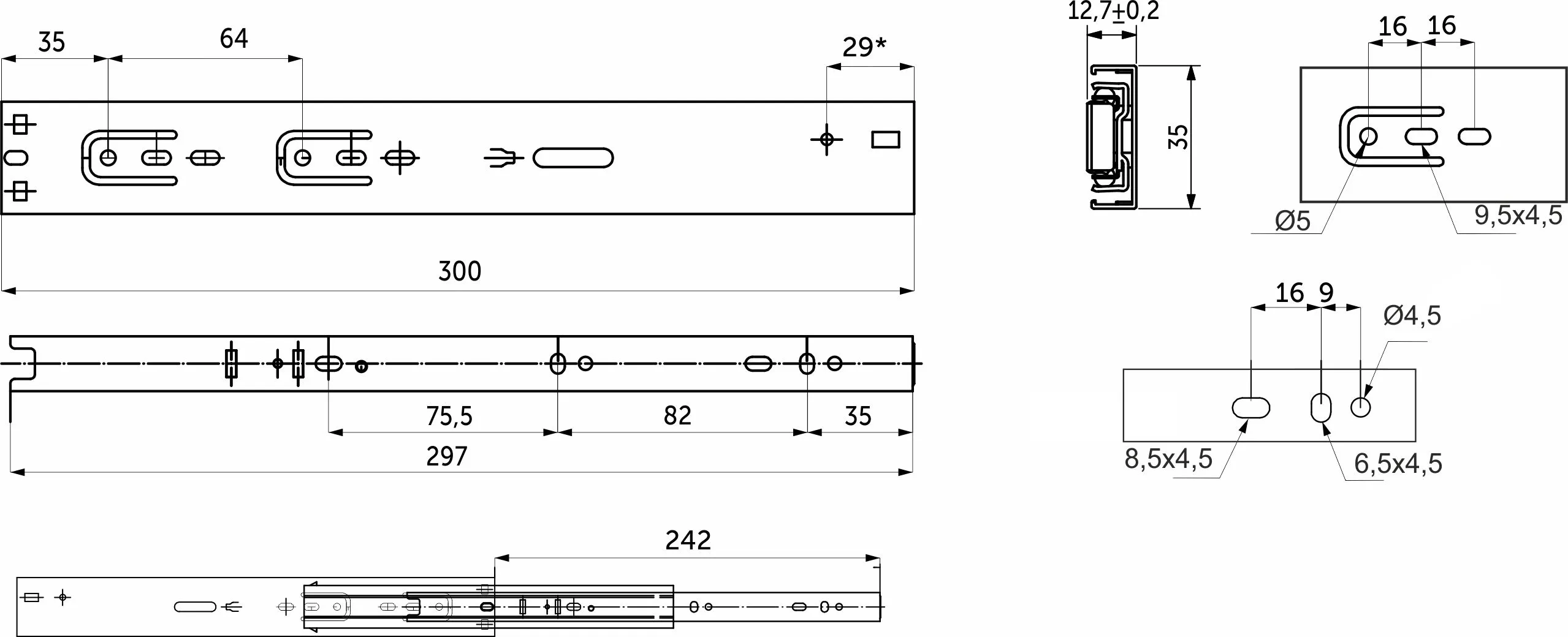 Направляющие для ящиков в 35-мм высоте оснащены доводчиком двухпружинным. Направляющие рассчитаны на постоянную нагрузку в 25 кг со сроком службы минимум 40 000 циклов. Имеют шарикоподшипниковые механизмы и телескопическую структуру, что обеспечивает полное выдвижение ящика (в связи с особенностью механизма имеется потеря 5см). Длина -300 мм. Функция сброса и бесшумного самодоката.