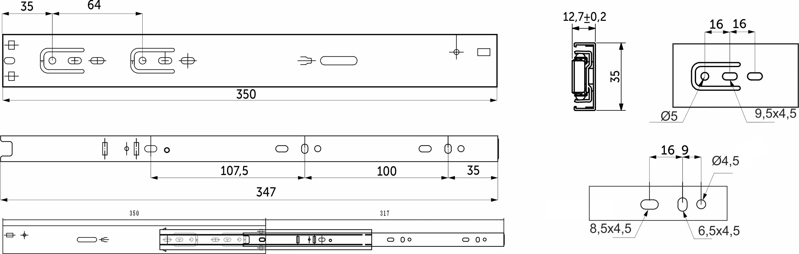 Направляющие для ящиков в 35-мм высоте оснащены доводчиком двухпружинным. Имеет усиленные толщины 1,2 мм из холоднокатаной стали. Направляющие рассчитаны на постоянную нагрузку в 25 кг со сроком службы минимум 40 000 циклов. Имеют шарикоподшипниковые механизмы и телескопическую структуру, что обеспечивает полное выдвижение ящика. Функция сброса и бесшумного самодоката.