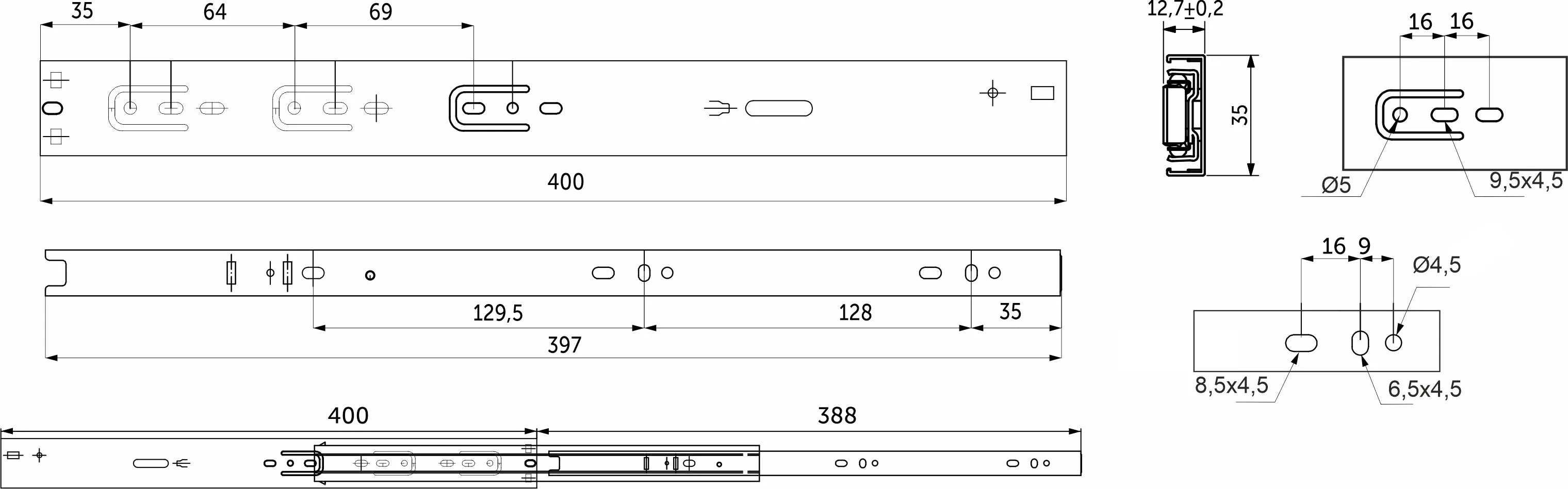 Направляющие для ящиков в 35-мм высоте оснащены доводчиком двухпружинным. Имеет усиленные толщины 1,2 из холоднокатаной стали. Направляющие рассчитаны на постоянную нагрузку в 25 кг со сроком службы минимум 40 000 циклов. Имеют шарикоподшипниковые механизмы и телескопическую структуру, что обеспечивает полное выдвижение ящика . Длина- 400 мм. Функция сброса и бесшумного самодоката.