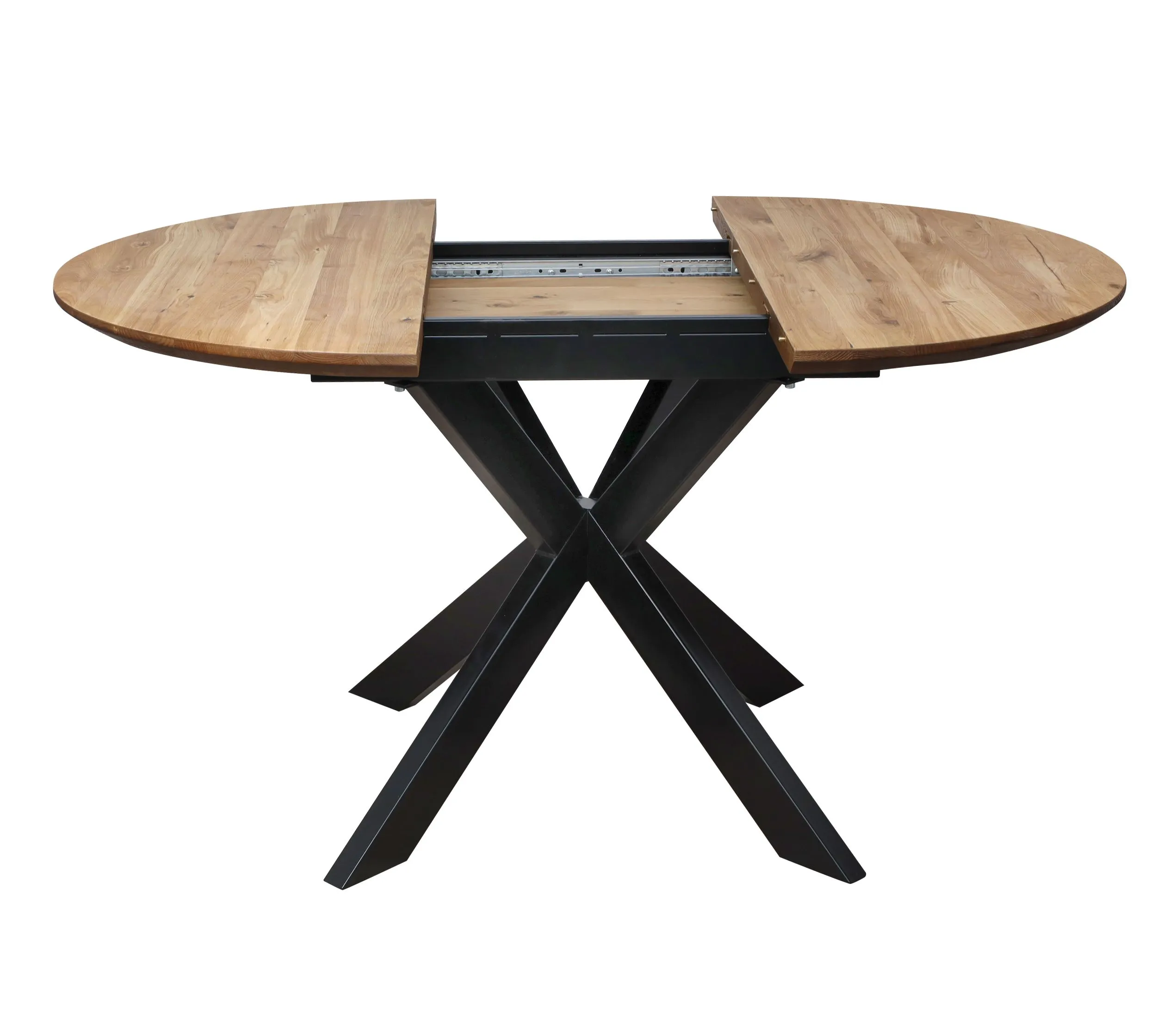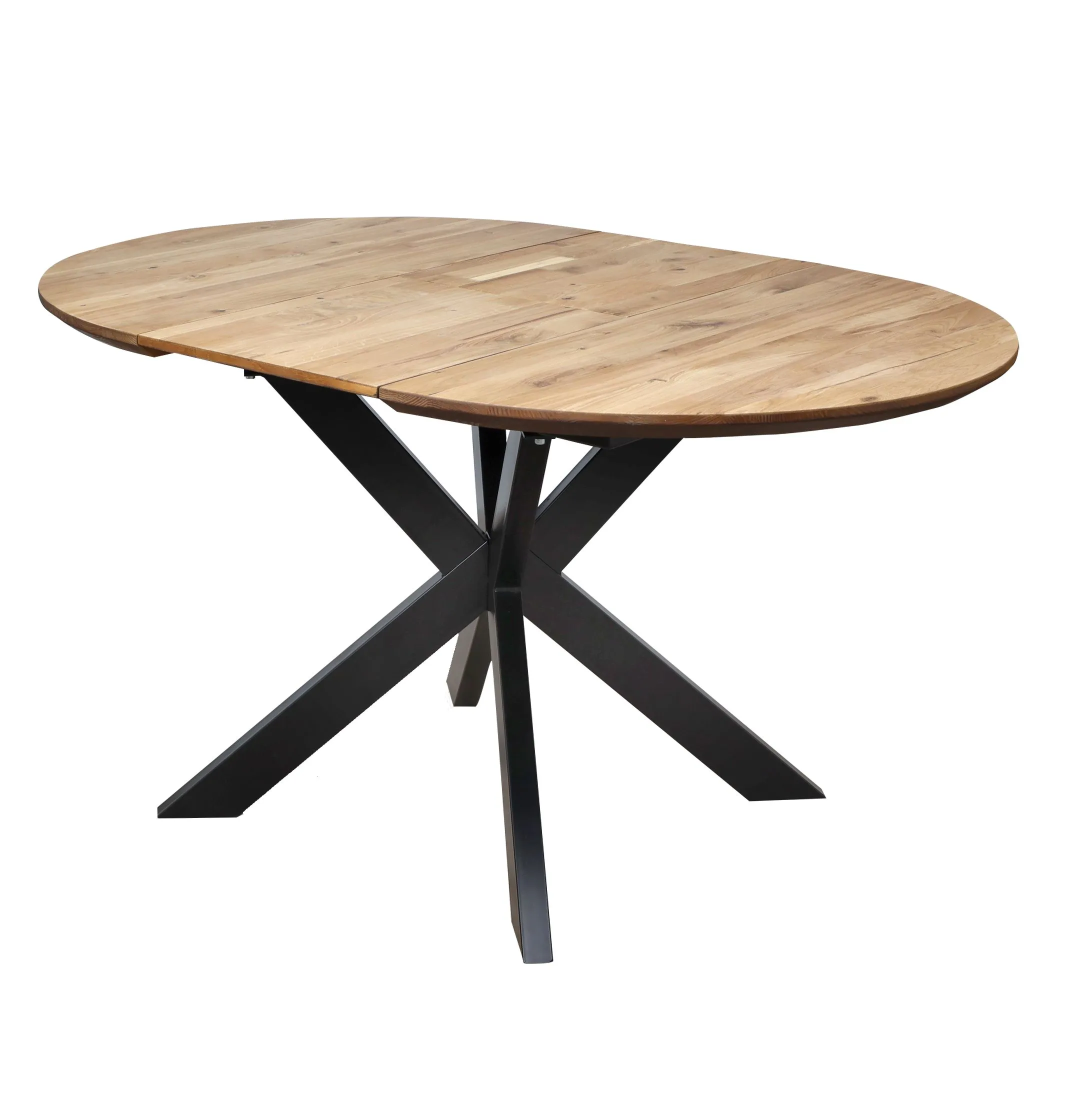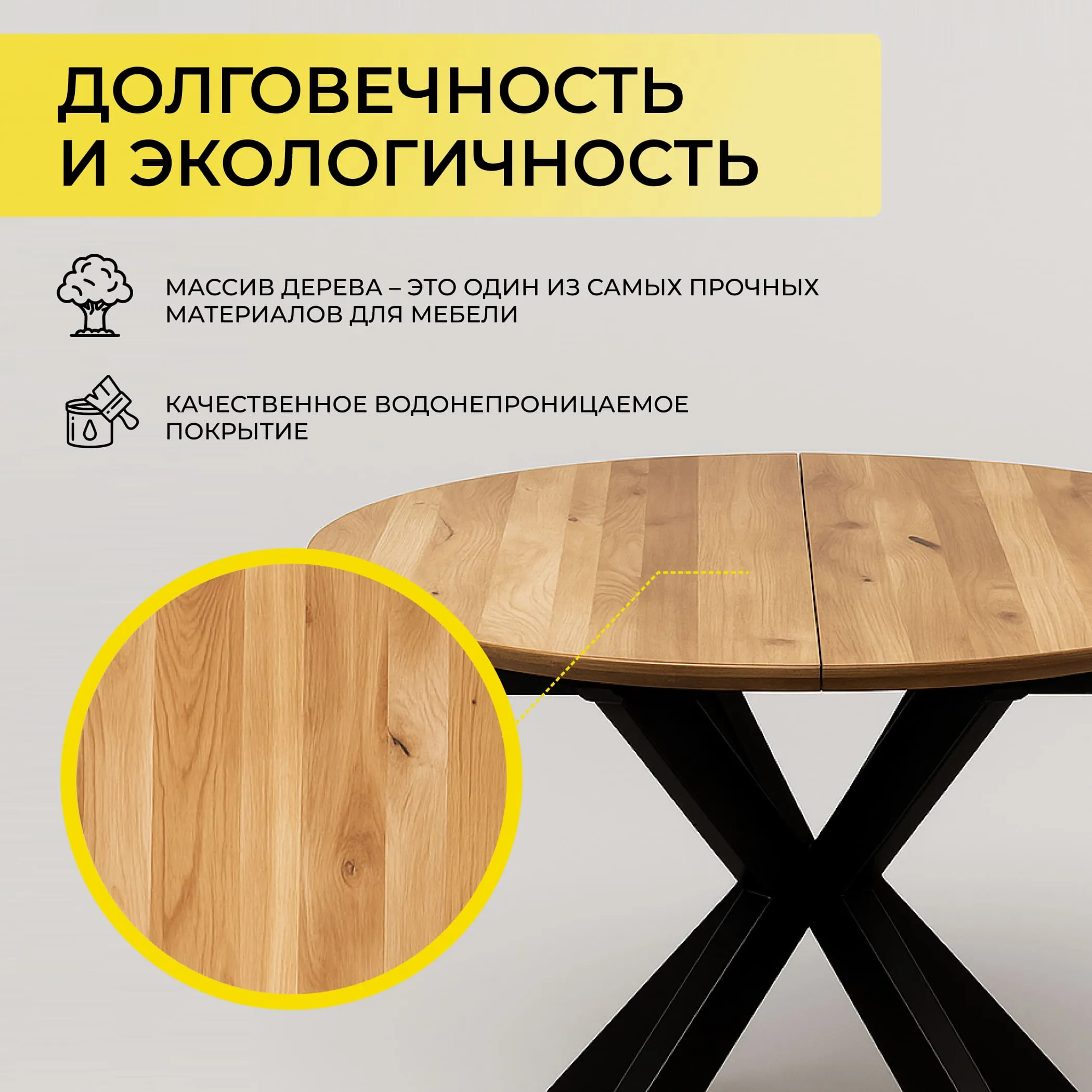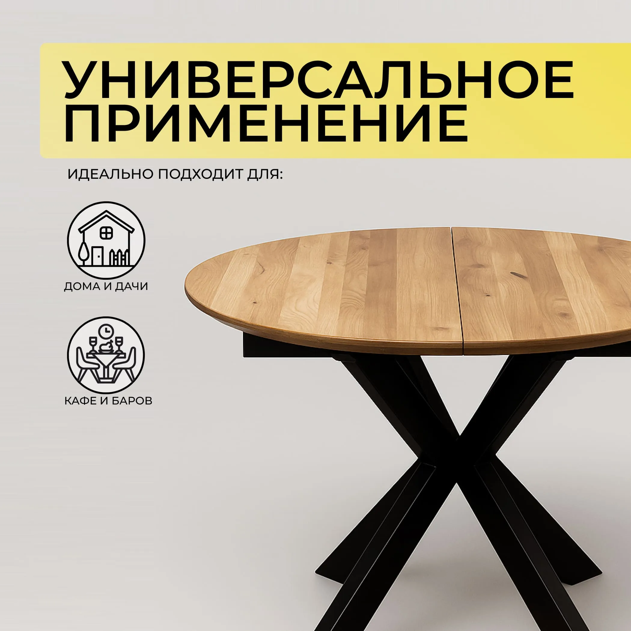 Обеденный стол РАУНД с раскладной столешницей. Круглая столешница толщиной 40 мм выполнена из инженерного массива. При необходимости длину стола можно увеличить на дополнительные 40 см.