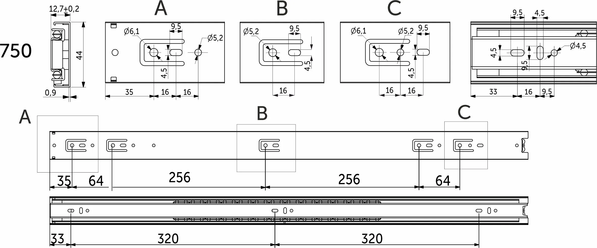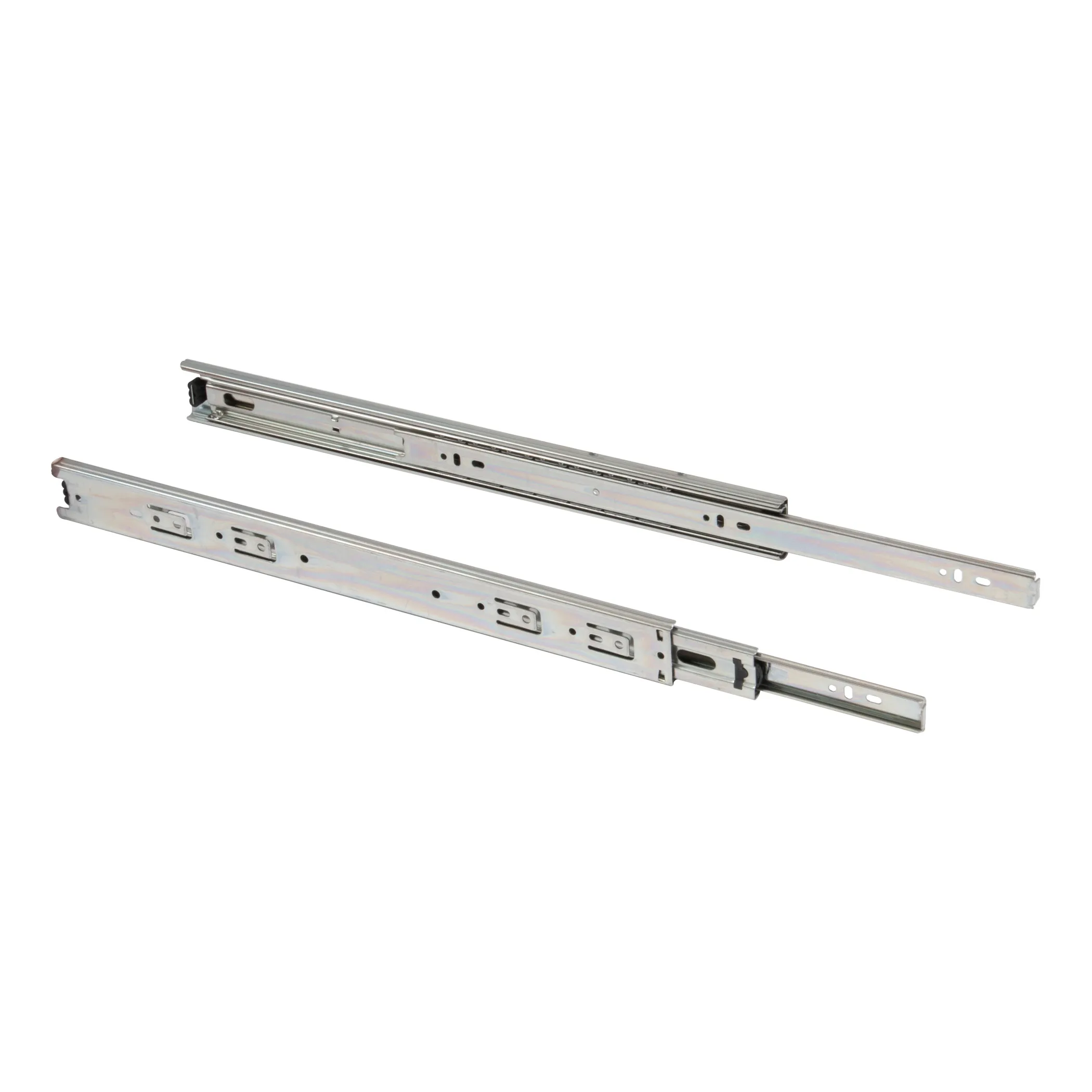 Классическая направляющая с шарикоподшипниковым механизмом и телескопической структурой, обеспечивает полное выдвижение. Изготовлена из холоднокатаной стали. Длина 750 мм. Резиновый фиксатор от самопроизвольного открытия.