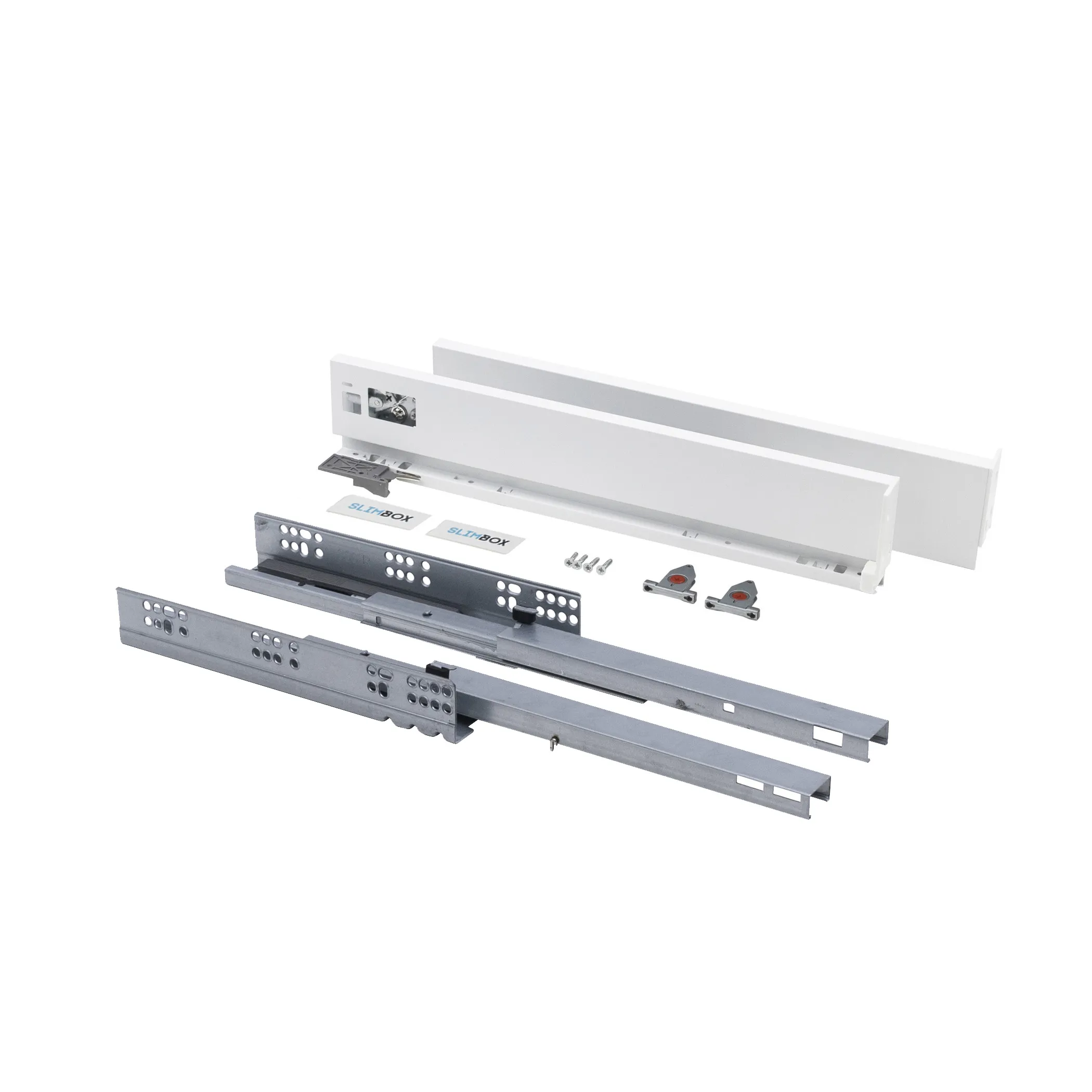 Slimbox с системой открытия от нажатия (push-to-open) представляет собой готовый комплект системы выдвижения с тонкими стальными боковинами. Толщина боковины в 13,5 мм позволяет увеличить полезное пространство ящика на 20%. Цвет: белый, высота ящика: 90 мм, длина направляющей: 300 мм.