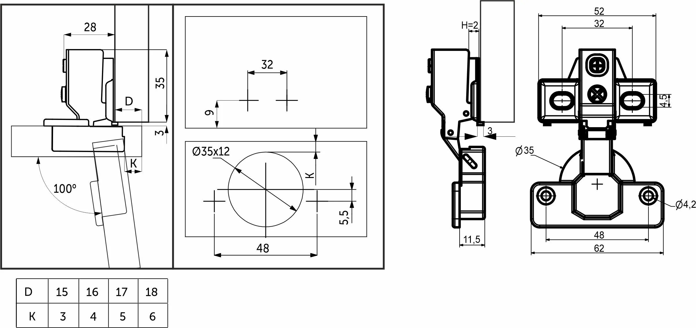 Петля предназначена для фасадов толщиной от 15 до 22 мм, имеет межцентровое расстояние между отверстиями в чашке в 48мм, а также высоту монтажной планки h2.