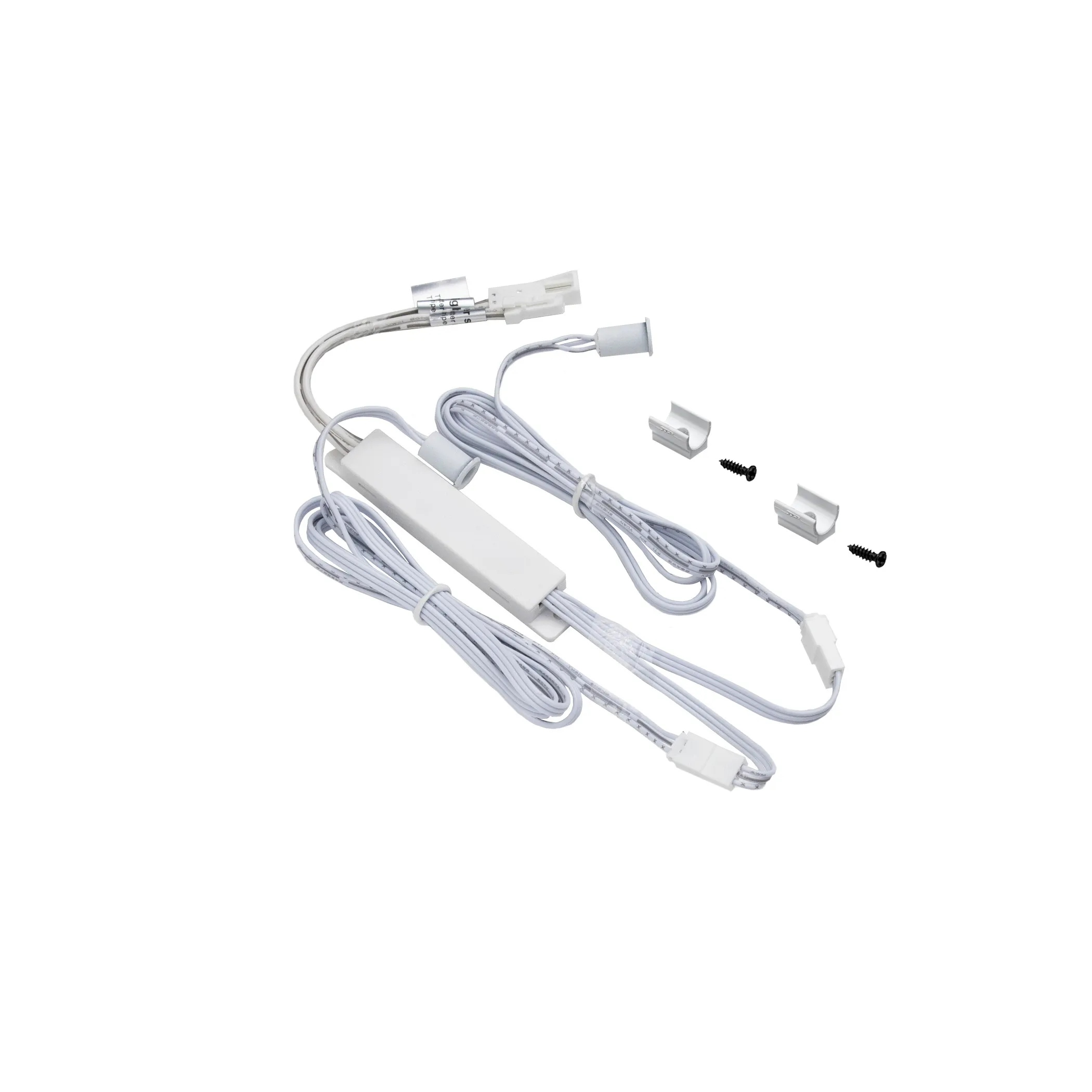 Датчик движения двойной белый с креплением, срабатывает на преграду для шкафов, по датчику на дверцу, дистанция срабатывания до 50 мм, рабочее напряжение 12-24VDC, мощность 60W/100W, степень защиты IP20, способ установки врезной или накладной, размер установочного отверстия 8мм, глубина 13 мм, длина провода до блока управления 1 м, длина проводов от блока управления до источника света и блока питания по 100 мм.