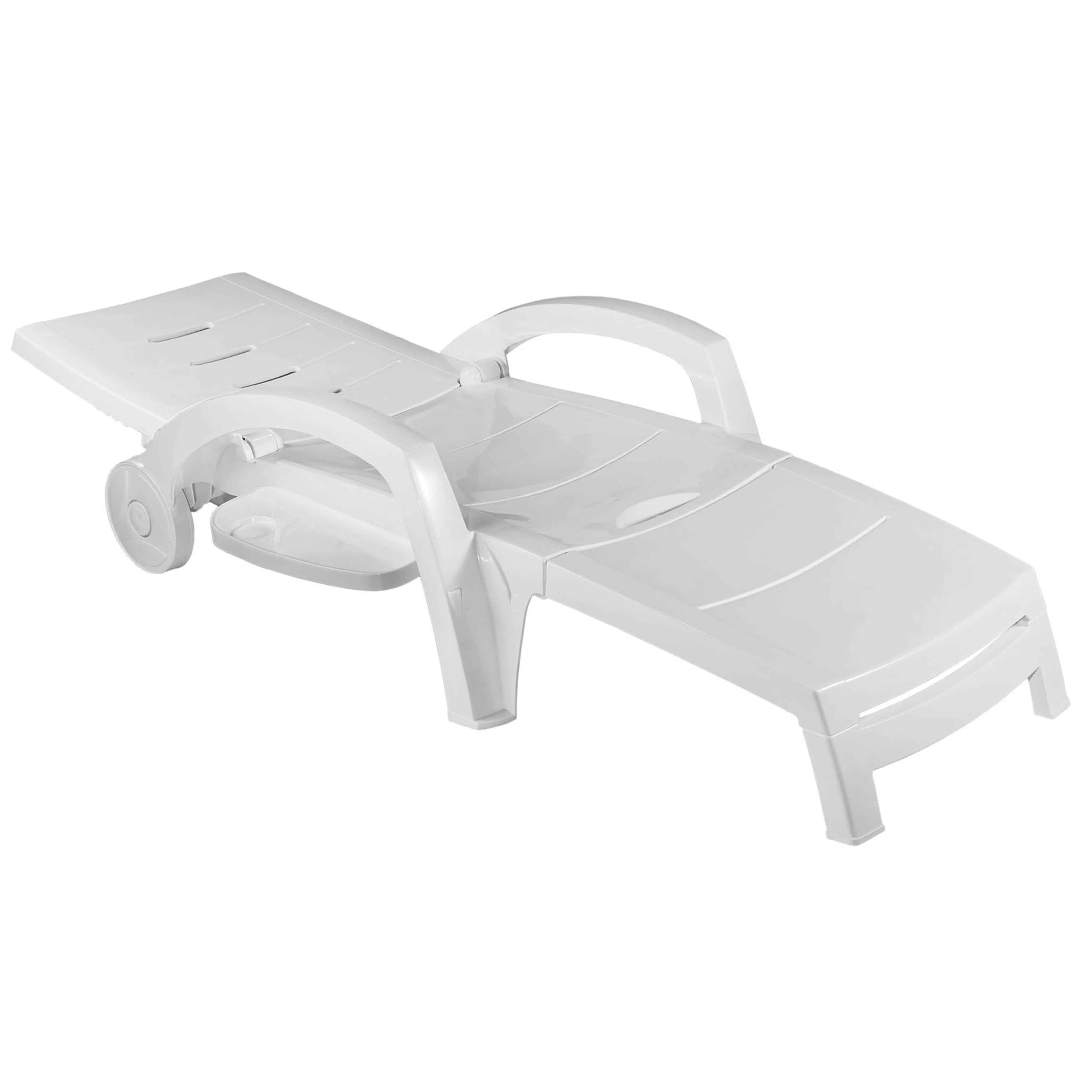Пластиковый шезлонг с подставкой для напитков и вместительным ящиком для хранения. Шезлонг легко передвигается, благодаря двум колесикам диаметром 19 см. Спинка фиксируется в четырех положениях.