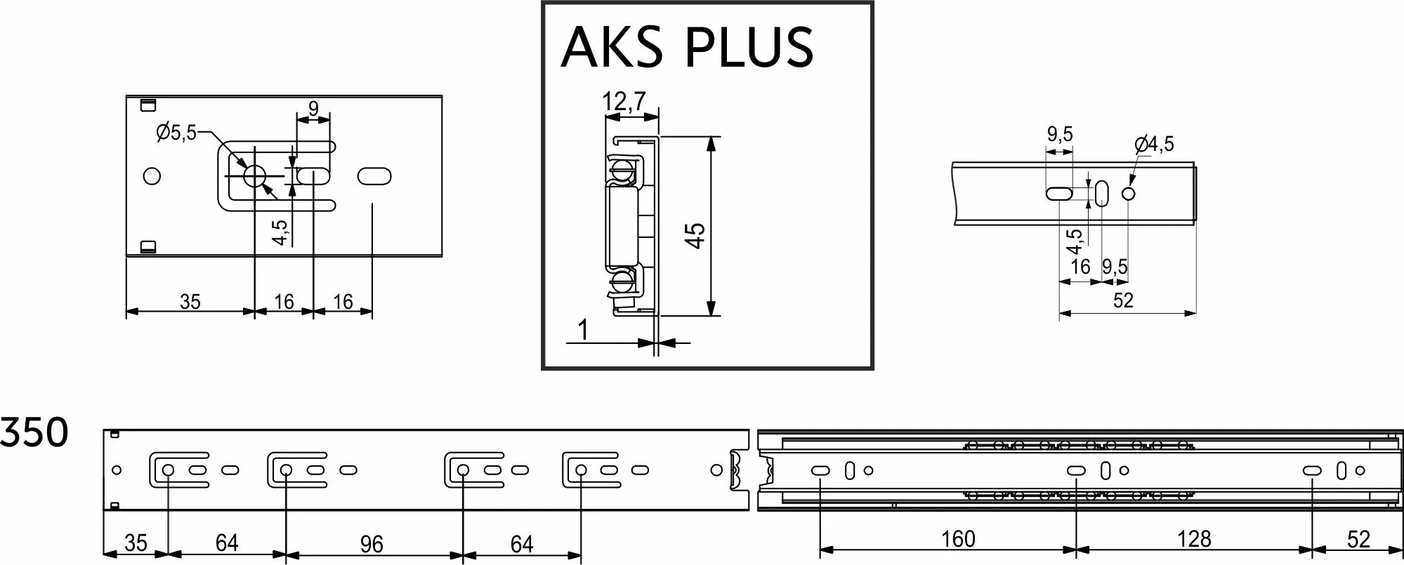 Направляющая шариковая L-350 h=45 AKS PLUS SOFT CLOSE A
