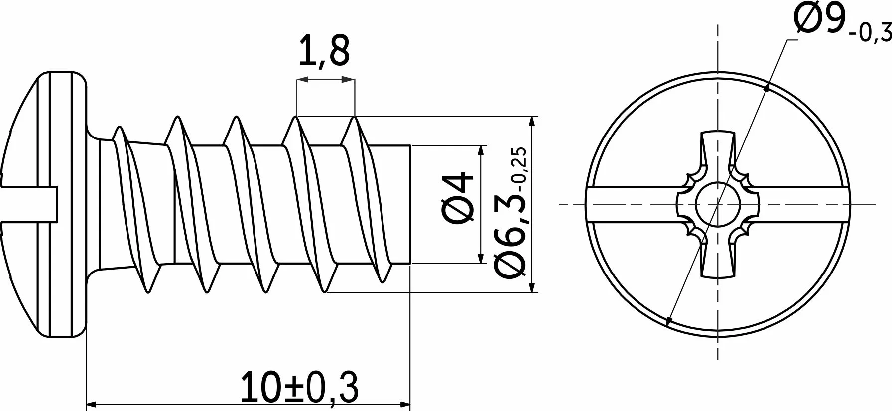 Длина 10 мм (длина данного шурупа считается от внутренней части головки, прилегающей к поверхности материала до кончика изделия).