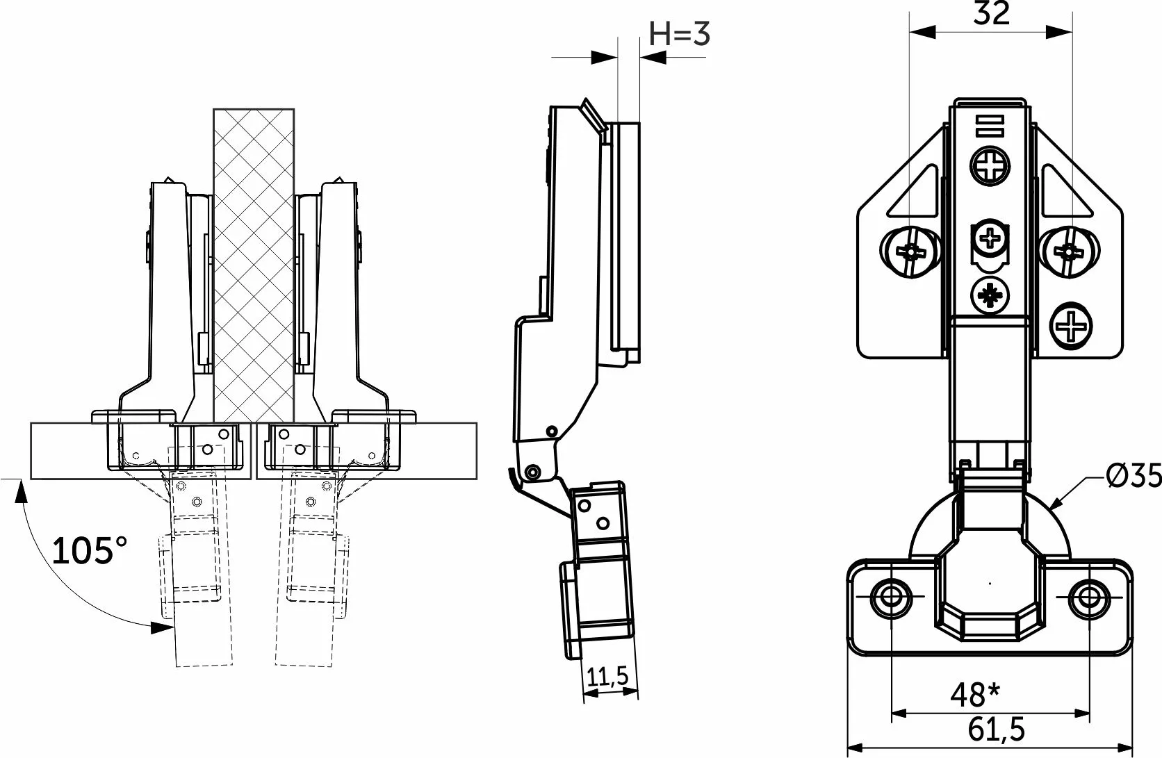 Петля полунакладная с доводчиком и системой быстрого монтажа clip on. Имеет современную систему регулировки в трех плоскостях по 4 мм при помощи эксцентриковых винтов в планке и теле петли. Межцентровое расстояние в чашке 48 мм.