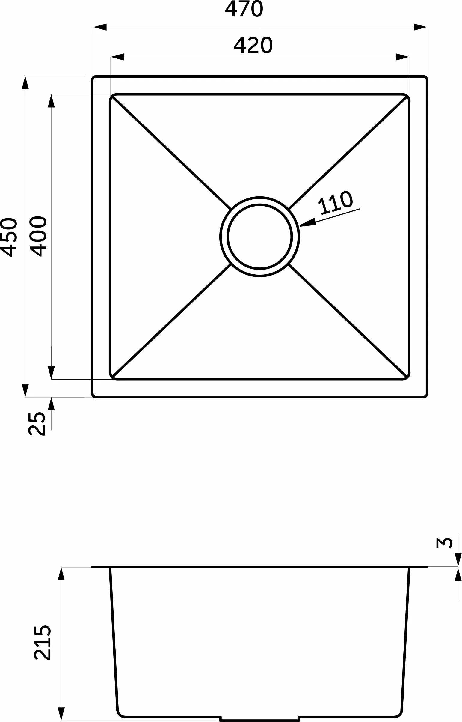 Мойка н/сталь, прямоугольная одночашевая, 470*450мм, сатин, универсальная, AKS (3,2мм)