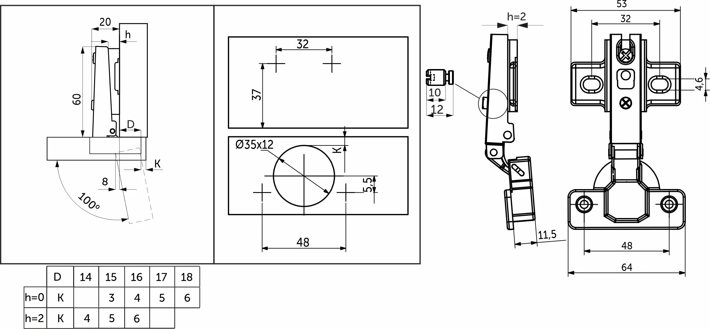 Петля предназначена для установки на фасад с перекрытием всех стенок корпуса примыкания к фасаду. Расстояние между отверстиями крепления чашки 48 мм.
